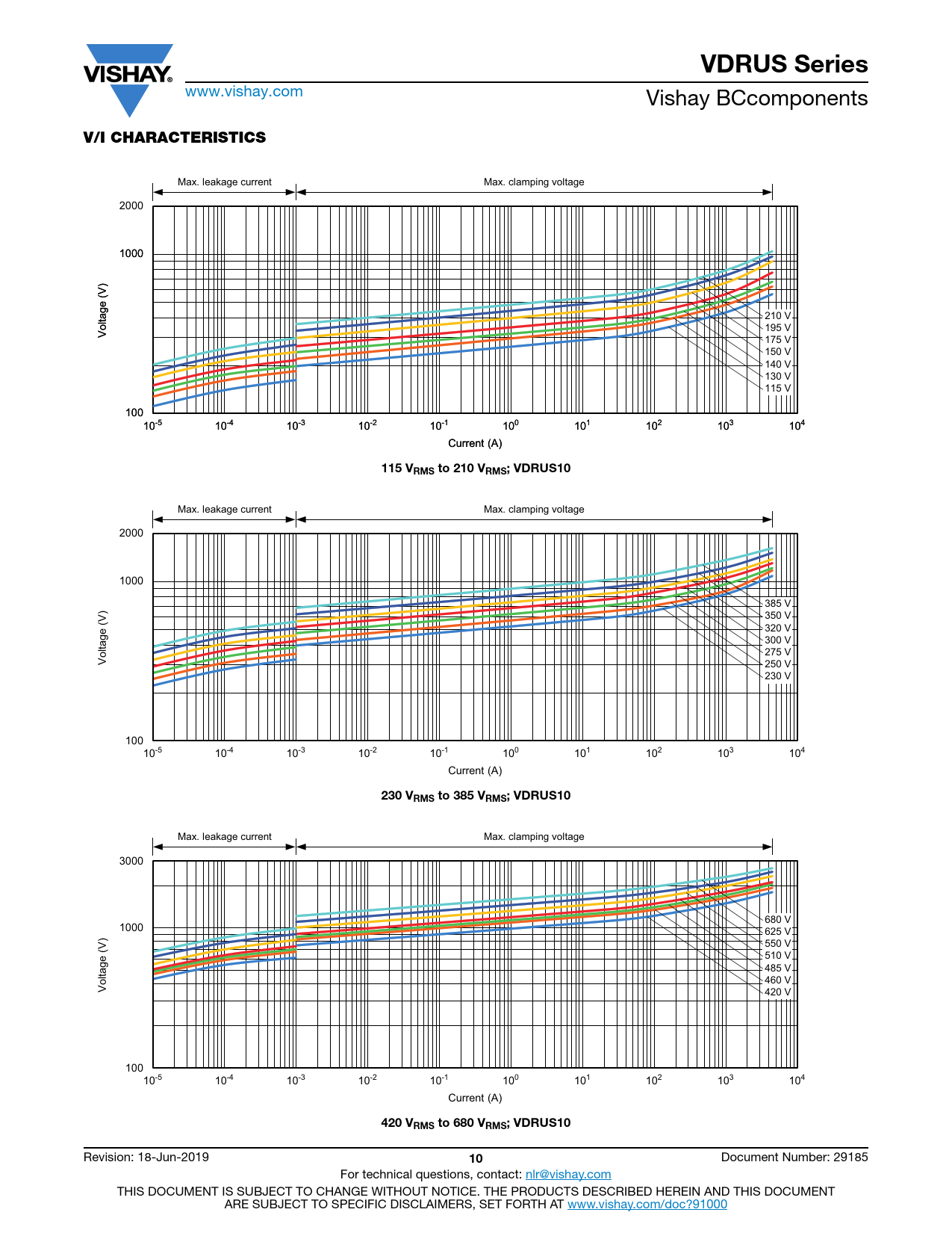 VDRUS Series V/I CHARACTERISTICS 115 VRMS to 210 VRMS; VDRUS10 230 VRMS to 385 VRMS; VDRUS10 420 VRMS to 680 VRMS; VDRUS10