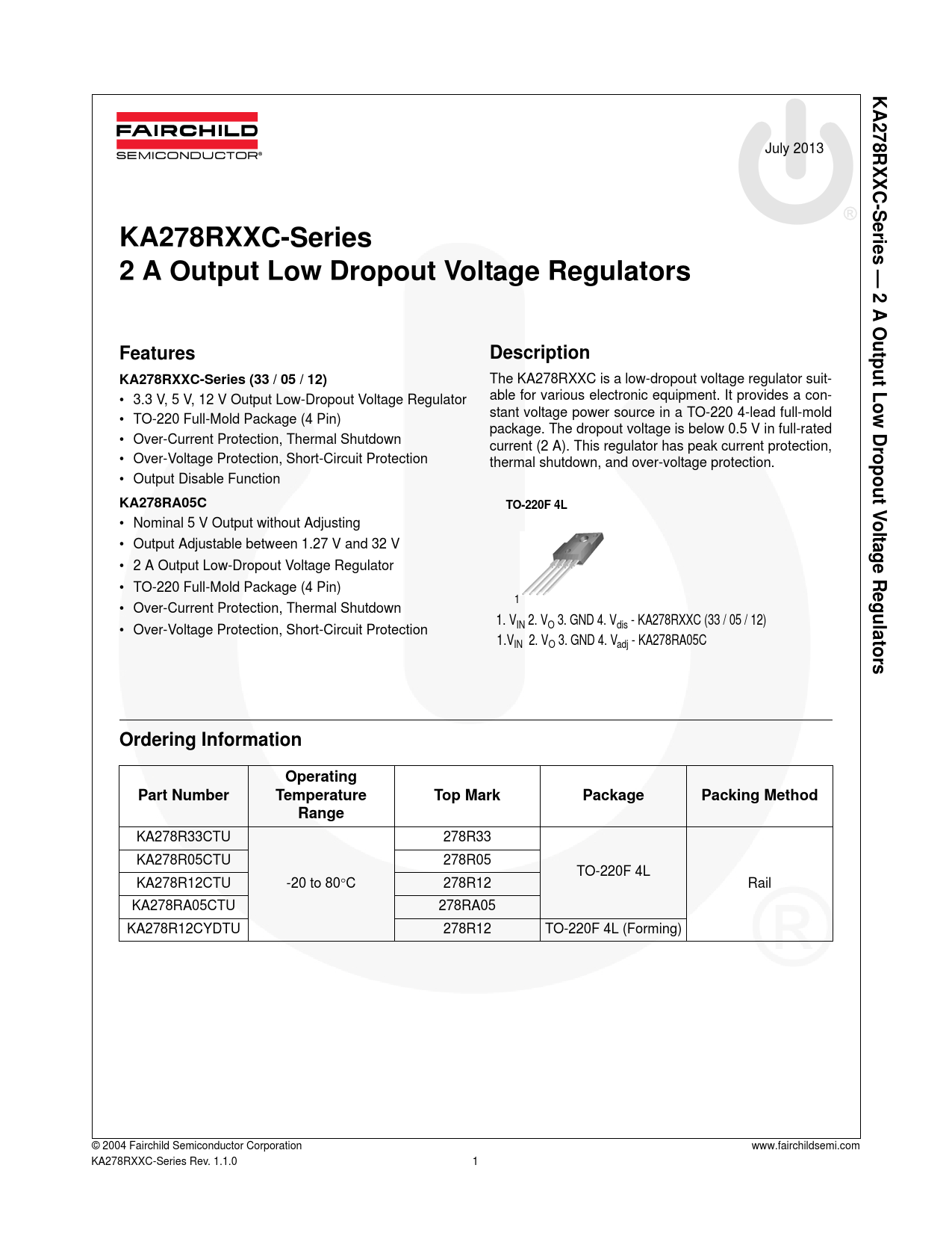 1 KA278RXXC-Series — 2 A Output Low Dropout Voltage Regulators July 2013