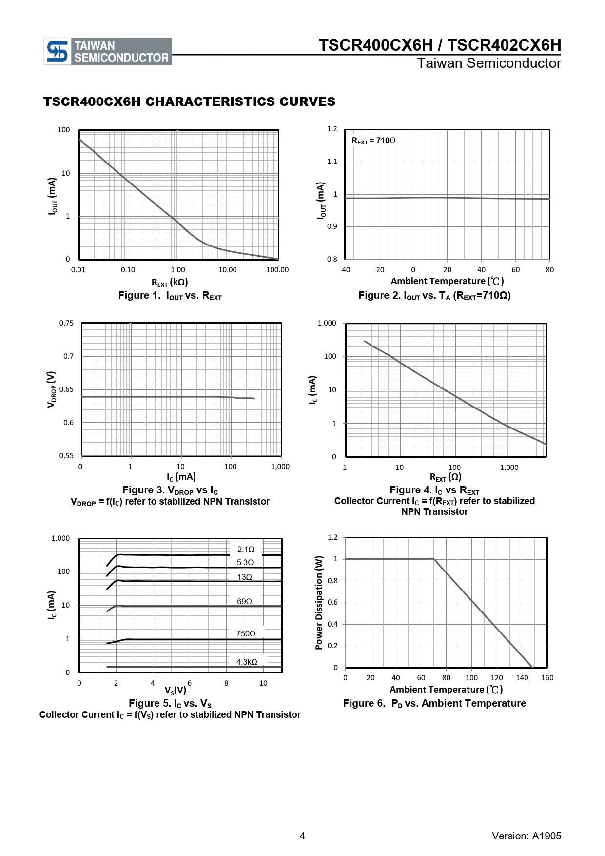 TSCR400CX6H / TSCR402CX6H Taiwan Semiconductor TSCR400CX6H CHARACTERISTICS CURVES 100 1.2 REXT = 710 Ω 1.1 10 ) A) A(m 1 T(m TI OU 1 I OU 0.9 0 0.8 0.01 0.10 1.00 10.00 100.00 -40 -20 0 20 40 60 80 RAmbient Temperature ( ℃ )EXT (kΩ)Figure 1. IOUT vs. REXTFigure 2. IOUT vs. TA (REXT=710Ω) 0.75 1,000 0.7 100 (V))A 0.65 OP 10 R(mDVI C 0.6 1 0.55 0 0 1 10 100 1,000 1 10 100 1,000 IC (mA)REXT (Ω)Figure 3. VDROP vs ICFigure 4. IC vs REXTVDROP = f(IC) refer to stabilized NPN TransistorCollector Current IC = f(REXT) refer to stabilizedNPN Transistor 1,000 1.2 2.1Ω ) 5.3Ω 1 100 (W 13Ω n o 0.8 i)tAa pm 69Ω i 10 0.6 (ssiI CD r 0.4 e 750Ω 1 w o 0.2 P 4.3kΩ 0 0 0 20 40 60 80 100 120 140 160 0 2 4 6 8 10 VAmbient Temperature ( ℃ )S(V)Figure 5. IC vs. VSFigure 6. PD vs. Ambient TemperatureCollector Current IC = f(VS) refer to stabilized NPN Transistor 4 Version: A1905