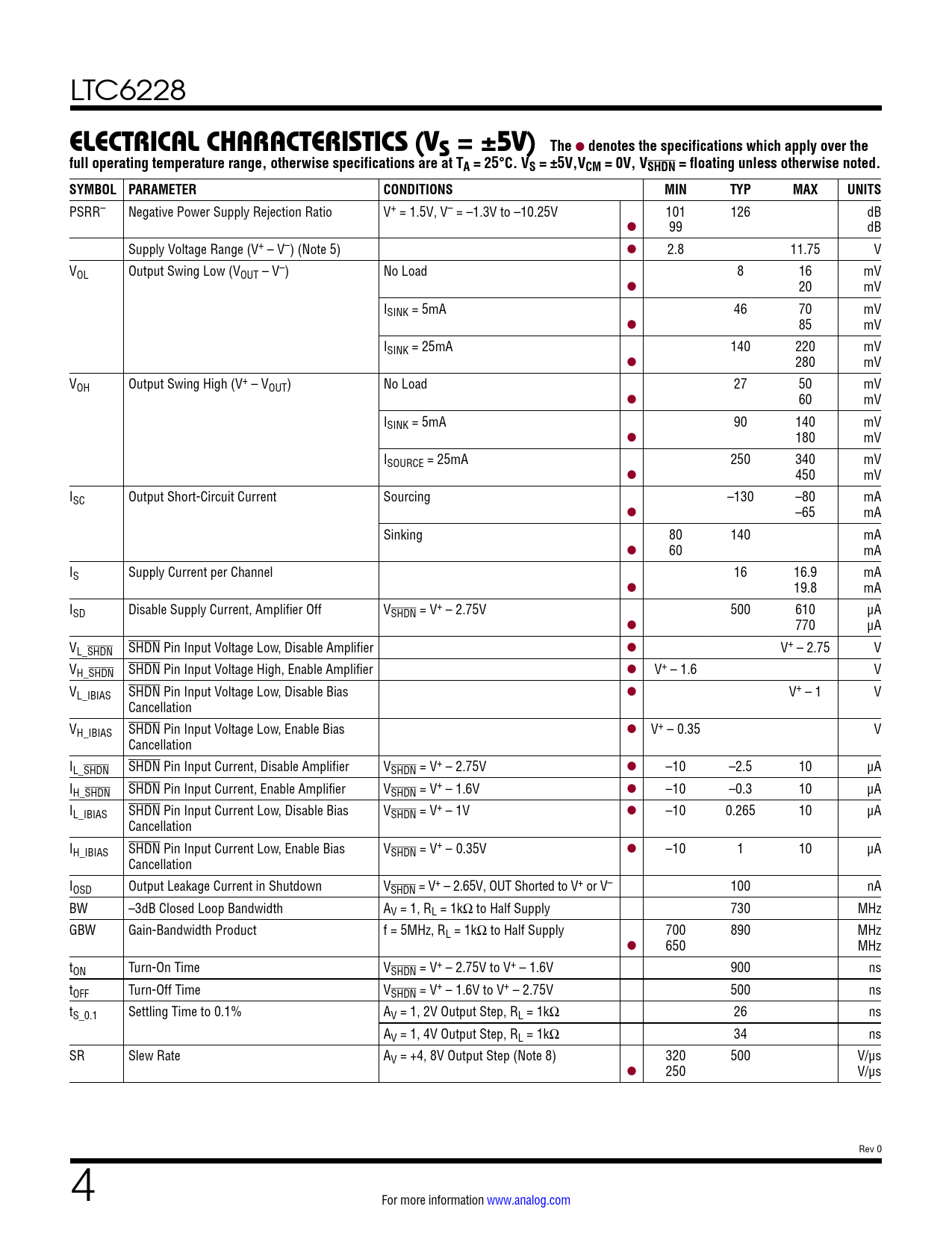 PSRR– Negative Power Supply Rejection Ratio V+ = 1.5V, V– = –1.3V to –10.25V 101 126 dB l 99 dB Supply Voltage Range (V+ – V–) (Note 5) l 2.8 11.75 V VOL Output Swing Low (VOUT – V–) No Load 8 16 mV l 20 mV ISINK = 5mA 46 70 mV l 85 mV ISINK = 25mA 140 220 mV l 280 mV VOH Output Swing High (V+ – VOUT) No Load 27 50 mV l 60 mV ISINK = 5mA 90 140 mV l 180 mV ISOURCE = 25mA 250 340 mV l 450 mV ISC Output Short-Circuit Current Sourcing –130 –80 mA l –65 mA Sinking 80 140 mA l 60 mA IS Supply Current per Channel 16 16.9 mA l 19.8 mA ISD Disable Supply Current, Amplifier Off VSHDN = V+ – 2.75V 500 610 μA l 770 μA VL_SHDN SHDN Pin Input Voltage Low, Disable Amplifier l V+ – 2.75 V VH_SHDN SHDN Pin Input Voltage High, Enable Amplifier l V+ – 1.6 V VL_IBIAS SHDN Pin Input Voltage Low, Disable Bias l V+ – 1 V Cancellation VH_IBIAS SHDN Pin Input Voltage Low, Enable Bias l V+ – 0.35 V Cancellation IL_SHDN SHDN Pin Input Current, Disable Amplifier VSHDN = V+ – 2.75V l –10 –2.5 10 μA IH_SHDN SHDN Pin Input Current, Enable Amplifier VSHDN = V+ – 1.6V l –10 –0.3 10 μA IL_IBIAS SHDN Pin Input Current Low, Disable Bias VSHDN = V+ – 1V l –10 0.265 10 μA Cancellation IH_IBIAS SHDN Pin Input Current Low, Enable Bias VSHDN = V+ – 0.35V l –10 1 10 μA Cancellation IOSD Output Leakage Current in Shutdown VSHDN = V+ – 2.65V, OUT Shorted to V+ or V– 100 nA BW –3dB Closed Loop Bandwidth AV = 1, RL = 1kΩ to Half Supply 730 MHz GBW Gain-Bandwidth Product f = 5MHz, RL = 1kΩ to Half Supply 700 890 MHz l 650 MHz tON Turn-On Time VSHDN = V+ – 2.75V to V+ – 1.6V 900 ns tOFF Turn-Off Time VSHDN = V+ – 1.6V to V+ – 2.75V 500 ns tS_0.1 Settling Time to 0.1% AV = 1, 2V Output Step, RL = 1kΩ 26 ns AV = 1, 4V Output Step, RL = 1kΩ 34 ns SR Slew Rate AV = +4, 8V Output Step (Note 8) 320 500 V/μs l 250 V/μs Rev 0 4 For more information www.analog.com Document Outline Features Applications Typical Application Description Absolute Maximum Ratings Pin Configuration Order Information Electrical Characteristics (VS = ±5V) Electrical Characteristics (VS = 5V, 0V) Electrical Characteristics (VS = 3V, 0V) Typical Performance Characteristics Pin Functions Applications Information Typical Applications Package Description Typical Application Related Parts