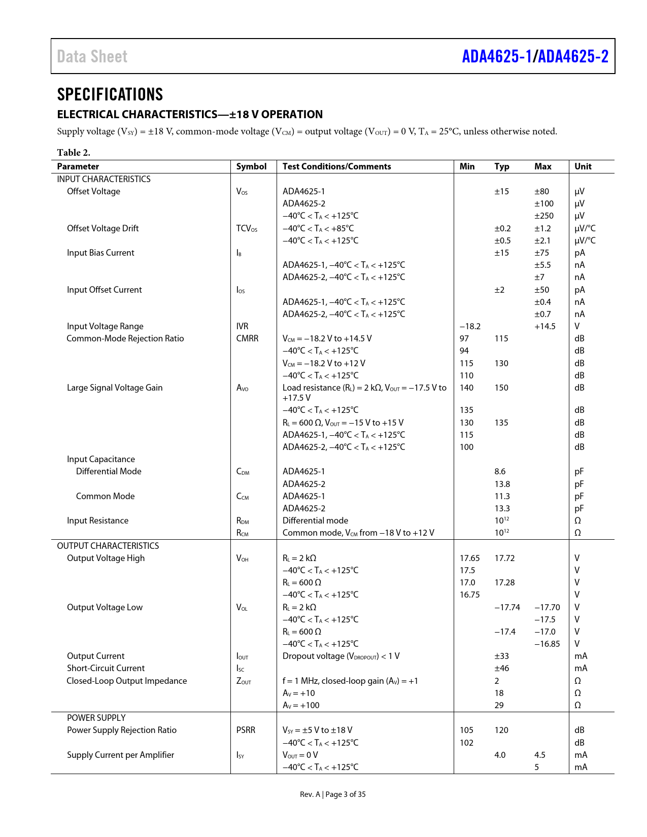 Data SheetADA4625-1/ADA4625-2SPECIFICATIONS ELECTRICAL CHARACTERISTICS—±18 V OPERATION Supply voltage (VSY) = ±18 V, common-mode voltage (VCM) = output voltage (VOUT) = 0 V, TA = 25°C, unless otherwise noted. Table 2. ParameterSymbolTest Conditions/CommentsMinTypMaxUnit INPUT CHARACTERISTICS Offset Voltage VOS ADA4625-1 ±15 ±80 µV ADA4625-2 ±100 µV −40°C < TA < +125°C ±250 µV Offset Voltage Drift TCVOS −40°C < TA < +85°C ±0.2 ±1.2 µV/°C −40°C < TA < +125°C ±0.5 ±2.1 µV/°C Input Bias Current IB ±15 ±75 pA ADA4625-1, −40°C < TA < +125°C ±5.5 nA ADA4625-2, −40°C < TA < +125°C ±7 nA Input Offset Current IOS ±2 ±50 pA ADA4625-1, −40°C < TA < +125°C ±0.4 nA ADA4625-2, −40°C < TA < +125°C ±0.7 nA Input Voltage Range IVR −18.2 +14.5 V Common-Mode Rejection Ratio CMRR VCM = −18.2 V to +14.5 V 97 115 dB −40°C < TA < +125°C 94 dB VCM = −18.2 V to +12 V 115 130 dB −40°C < TA < +125°C 110 dB Large Signal Voltage Gain AVO Load resistance (RL) = 2 kΩ, VOUT = −17.5 V to 140 150 dB +17.5 V −40°C < TA < +125°C 135 dB RL = 600 Ω, VOUT = −15 V to +15 V 130 135 dB ADA4625-1, −40°C < TA < +125°C 115 dB ADA4625-2, −40°C < TA < +125°C 100 dB Input Capacitance Differential Mode CDM ADA4625-1 8.6 pF ADA4625-2 13.8 pF Common Mode CCM ADA4625-1 11.3 pF ADA4625-2 13.3 pF Input Resistance RDM Differential mode 1012 Ω RCM Common mode, VCM from −18 V to +12 V 1012 Ω OUTPUT CHARACTERISTICS Output Voltage High VOH RL = 2 kΩ 17.65 17.72 V −40°C < TA < +125°C 17.5 V RL = 600 Ω 17.0 17.28 V −40°C < TA < +125°C 16.75 V Output Voltage Low VOL RL = 2 kΩ −17.74 −17.70 V −40°C < TA < +125°C −17.5 V RL = 600 Ω −17.4 −17.0 V −40°C < TA < +125°C −16.85 V Output Current IOUT Dropout voltage (VDROPOUT) < 1 V ±33 mA Short-Circuit Current ISC ±46 mA Closed-Loop Output Impedance ZOUT f = 1 MHz, closed-loop gain (AV) = +1 2 Ω AV = +10 18 Ω AV = +100 29 Ω POWER SUPPLY Power Supply Rejection Ratio PSRR VSY = ±5 V to ±18 V 105 120 dB −40°C < TA < +125°C 102 dB Supply Current per Amplifier ISY VOUT = 0 V 4.0 4.5 mA −40°C < TA < +125°C 5 mA Rev. A | Page 3 of 35 Document Outline FEATURES APPLICATIONS GENERAL DESCRIPTION PIN CONFIGURATION TABLE OF CONTENTS REVISION HISTORY SPECIFICATIONS ELECTRICAL CHARACTERISTICS—±18 V OPERATION ELECTRICAL CHARACTERISTICS—5 V OPERATION ABSOLUTE MAXIMUM RATINGS THERMAL RESISTANCE ESD CAUTION PIN CONFIGURATIONS AND FUNCTION DESCRIPTIONS TYPICAL PERFORMANCE CHARACTERISTICS THEORY OF OPERATION INPUT AND GAIN STAGES OUTPUT STAGE NO PHASE INVERSION SUPPLY CURRENT APPLICATIONS INFORMATION ACTIVE LOOP FILTER FOR PHASE-LOCKED LOOPS (PLLS) PLL Basic Loop Filter ADA4625-1 ADVANTAGES AND DESIGN EXAMPLE TRANSIMPEDANCE AMPLIFIER Design Example DAC OUTPUT DRIVER RECOMMENDED POWER SOLUTION INPUT OVERVOLTAGE PROTECTION DRIVING CAPACITIVE LOADS THERMAL MANAGEMENT TYPICAL APPLICATIONS OUTLINE DIMENSIONS ORDERING GUIDE