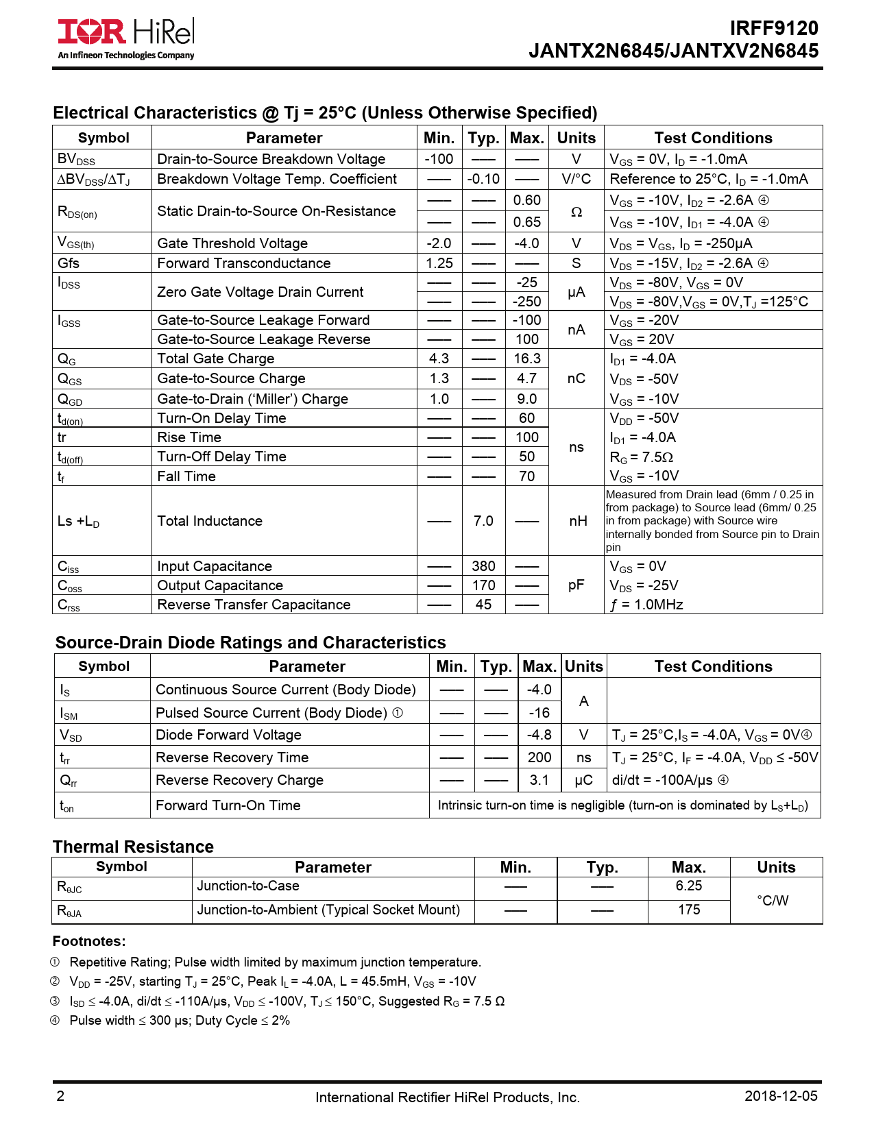 IRFF9120. JANTX2N6845/JANTXV2N6845. Electrical Characteristics @ Tj = 25°C (Unless Otherwise Specified). Symbol. Parameter Min