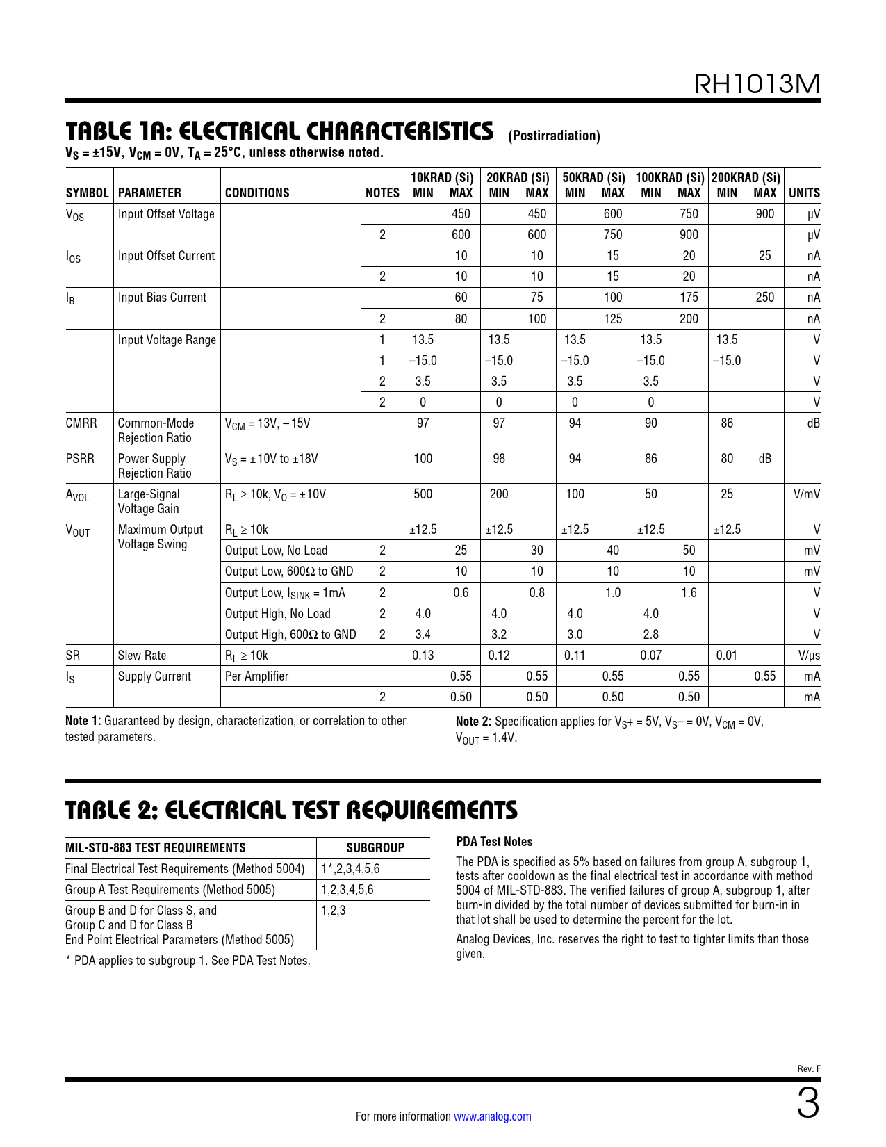 TABLE 1A: ELECTRICAL CHARACTERISTICS (Postirradiation) VS = ±15V, VCM = 0V, TA = 25°C, unless otherwise noted. 10KRAD (Si) 20KRAD (Si) 50KRAD (Si) 100KRAD (Si) 200KRAD (Si) SYMBOL PARAMETER CONDITIONS NOTES MIN MAX MIN MAX MIN MAX MIN MAX MIN MAX UNITS