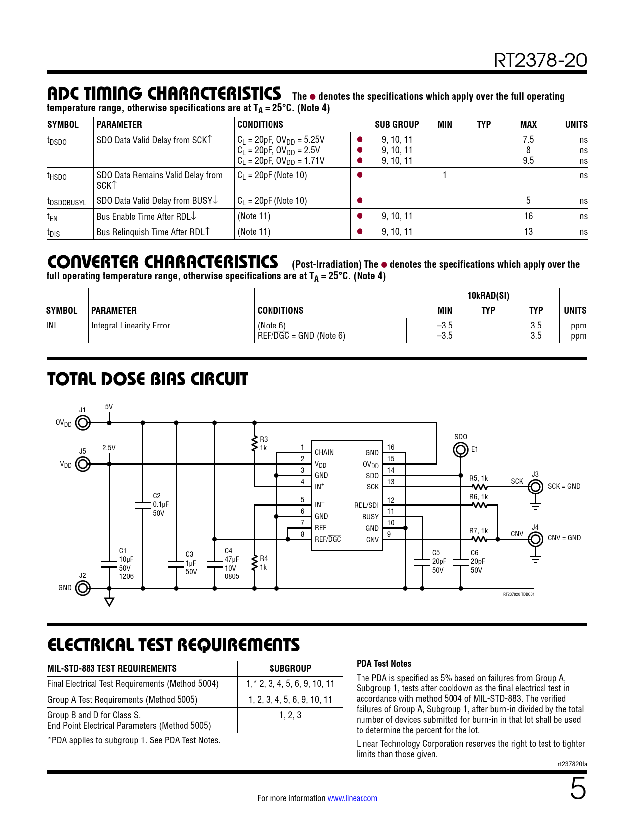 The PDA is specified as 5% based on failures from Group A, Final Electrical Test Requirements (Method 5004) 1,* 2, 3, 4, 5, 6, 9, 10, 11 Subgroup 1, tests after cooldown as the final electrical test in Group A Test Requirements (Method 5005) 1, 2, 3, 4, 5, 6, 9, 10, 11 accordance with method 5004 of MIL-STD-883. The verified failures of Group A, Subgroup 1, after burn-in divided by the total Group B and D for Class S. 1, 2, 3 number of devices submitted for burn-in in that lot shall be used End Point Electrical Parameters (Method 5005) to determine the percent for the lot. *PDA applies to subgroup 1. See PDA Test Notes. Linear Technology Corporation reserves the right to test to tighter limits than those given. rt237820fa For more information www.linear.com 5 Document Outline Features Description Typical Application Absolute Maximum Ratings Pin Configuration Electrical Characteristics Converter Characteristics Dynamic Accuracy Reference Input Digital Inputs and Digital Outputs Power Requirements ADC Timing Characteristics Typical Performance Characteristics