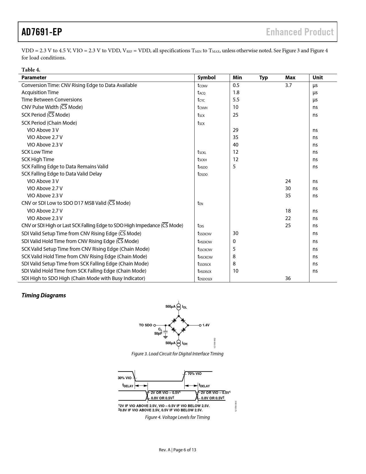 AD7691-EP. Enhanced Product. Table 4. Parameter. Symbol Min Typ Max Unit. Timing Diagrams. 500µA. IOL. TO SDO. 1.4V. 50pF. 70% VIO. 30% VIO