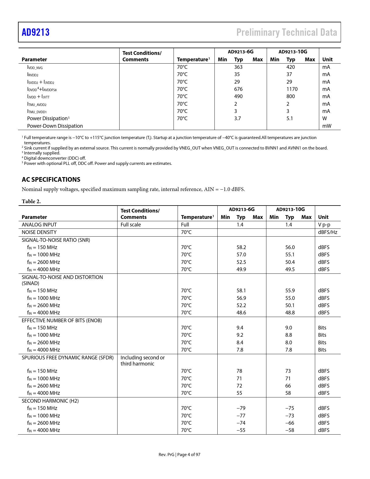 页数 / 页97 / 4 — AD9213. Preliminary Technical Data. Test Conditions/. AD9213-6G. …