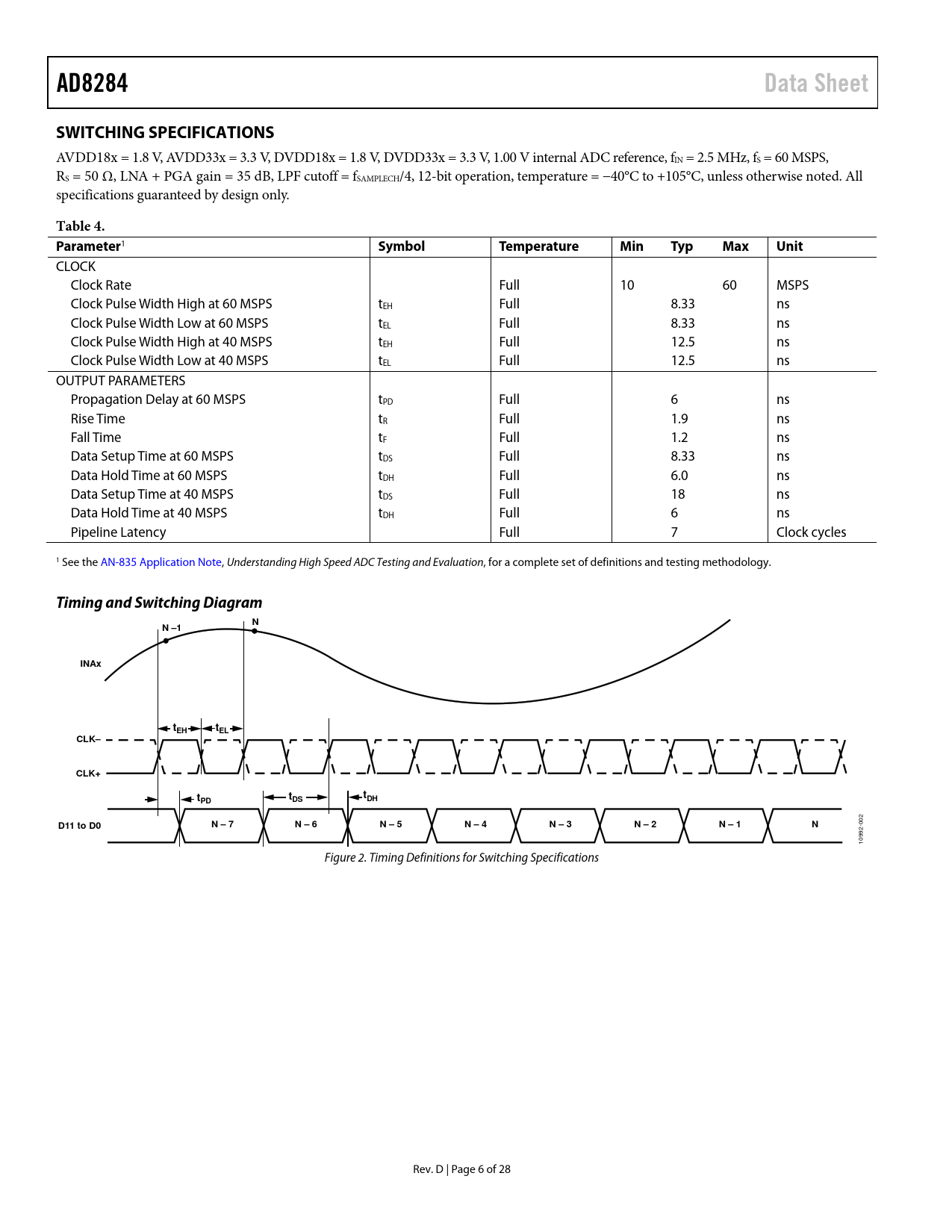 页数 / 页28 / 6 — AD8284. Data Sheet. SWITCHING SPECIFICATIONS. Table 4. Parameter. Symbol. …