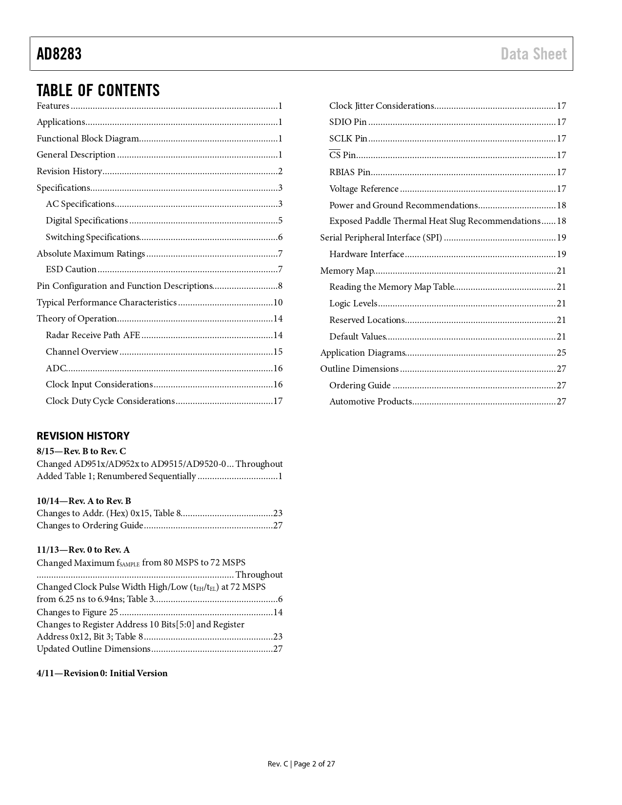 页数 / 页27 / 2 — AD8283. Data Sheet. TABLE OF CONTENTS. REVISION HISTORY 8/15—Rev. B to …