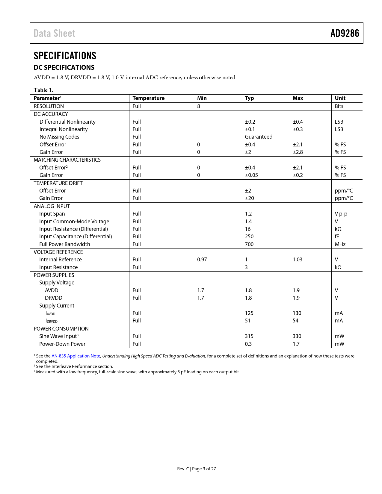 Data Sheet AD9286 SPECIFICATIONS DC SPECIFICATIONS Table 1 Parameter1 Temperature Min Typ Max Unit