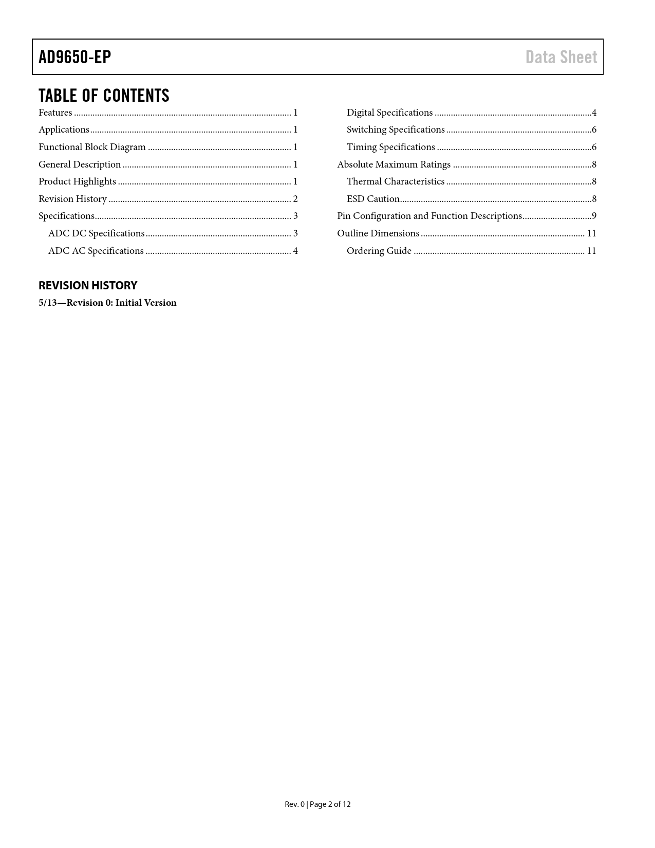 link to page 1 link to page 1 link to page 1 link to page 1 link to page 1 link to page 2 link to page 3 link to page 3 link to page 4 link to page 4 link to page 6 link to page 6 link to page 8 link to page 8 link to page 8 link to page 9 link to page 11 link to page 11 AD9650-EPData SheetTABLE OF CONTENTS Features .. 1 Digital Specifications ..4 Applications ... 1 Switching Specifications ...6 Functional Block Diagram .. 1 Timing Specifications ...6 General Description ... 1 Absolute Maximum Ratings ..8 Product Highlights ... 1 Thermal Characteristics ...8 Revision History ... 2 ESD Caution...8 Specifications ... 3 Pin Configuration and Function Descriptions ..9 ADC DC Specifications ... 3 Outline Dimensions ... 11 ADC AC Specifications ... 4 Ordering Guide .. 11 REVISION HISTORY5/13—Revision 0: Initial Version Rev. 0 | Page 2 of 12 Document Outline Features Applications Functional Block Diagram General Description Product Highlights Table of Contents Revision History Specifications ADC DC Specifications ADC AC Specifications Digital Specifications Switching Specifications Timing Specifications Timing Diagrams Absolute Maximum Ratings Thermal Characteristics ESD Caution Pin Configuration and Function Descriptions Outline Dimensions Ordering Guide