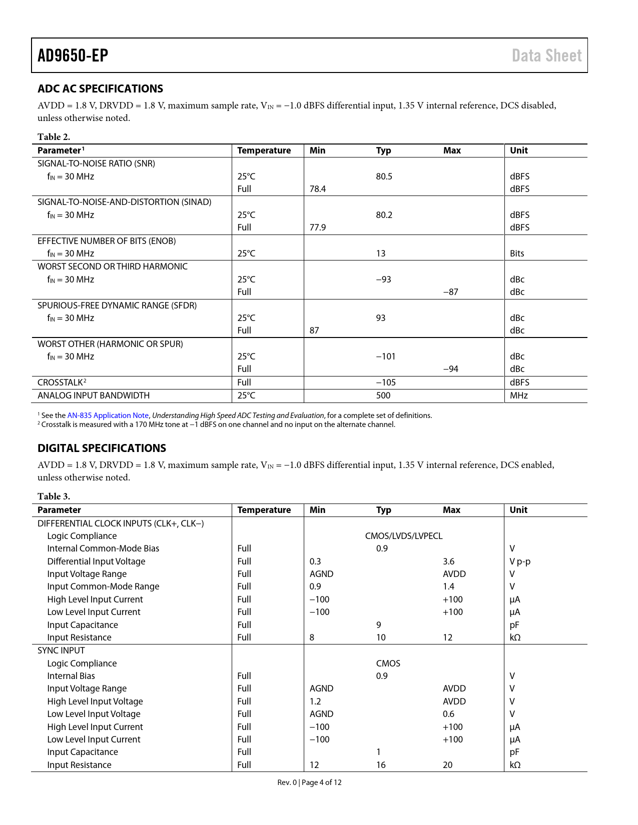 页数 / 页12 / 4 — AD9650-EP. Data Sheet. ADC AC SPECIFICATIONS. Table 2. Parameter1. …
