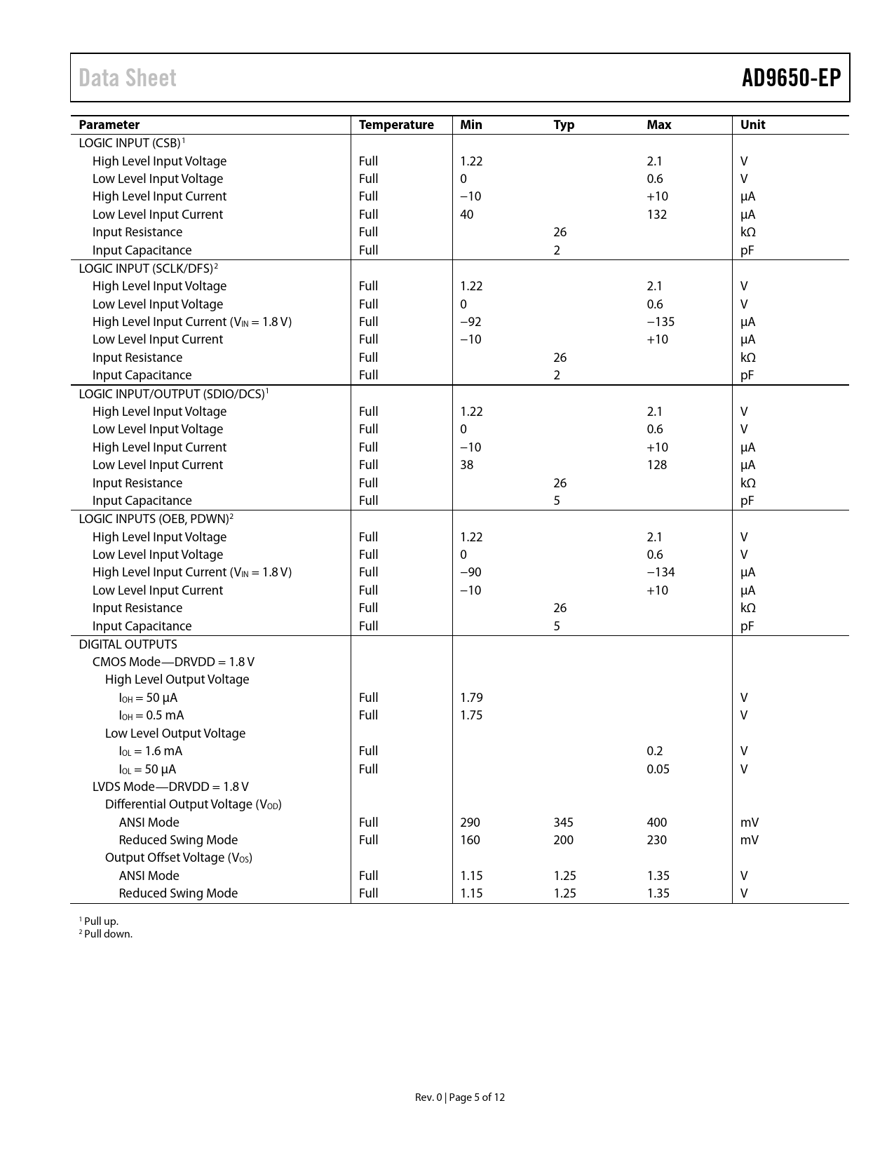 页数 / 页12 / 5 — Data Sheet. AD9650-EP. Parameter. Temperature. Min. Typ. Max. Unit