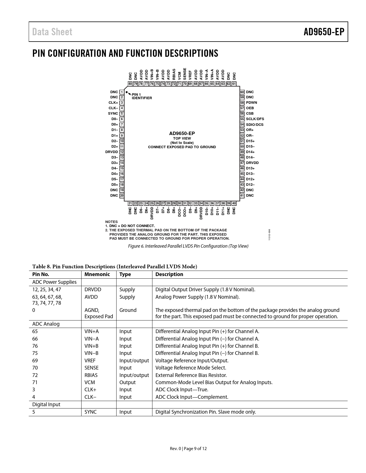 Data Sheet AD9650-EP PIN CONFIGURATION AND FUNCTION DESCRIPTIONS B SE A DD DD DD DD AS EF DD DD DD DD IN+ IN–B CM IN–A IN+ DNC DNC AV AV V V AV AV RBI V SEN VR AV AV V V AV AV DNC DNC 80 79 78 77 76 75 74 73 72 71 70 69 68 67 66 65 64 63 62 61 DNC 1 60 DNC PIN 1 DNC 2 IDENTIFIER 59 DNC CLK+ 3 58 PDWN CLK– 4 57 OEB SYNC 5 56 CSB D0– 6 55 SCLK/DFS D0+ 7 54 SDIO/DCS D1– 8 53 OR+ AD9650-EP D1+ 9 52 OR– TOP VIEW D2– 10 51 D15+ (Not to Scale) D2+ 11 50 CONNECT EXPOSED PAD TO GROUND D15– DRVDD 12 49 D14+ D3– 13 48 D14– D3+ 14 47 DRVDD D4– 15 46 D13+ D4+ 16 45 D13– D5– 17 44 D12+ D5+ 18 43 D12– DNC 19 42 DNC DNC 20 41 DNC 21 22 23 24 25 26 27 28 29 30 31 32 33 34 35 36 37 38 39 40 + DD DD DNC DNC D6– D6+ D7– D7+ D8– D8+ D9– D9+ DCO D10– D10+ DCO D11– D11+ DNC DNC DRV DRV NOTES 1. DNC = DO NOT CONNECT. 2. THE EXPOSED THERMAL PAD ON THE BOTTOM OF THE PACKAGE