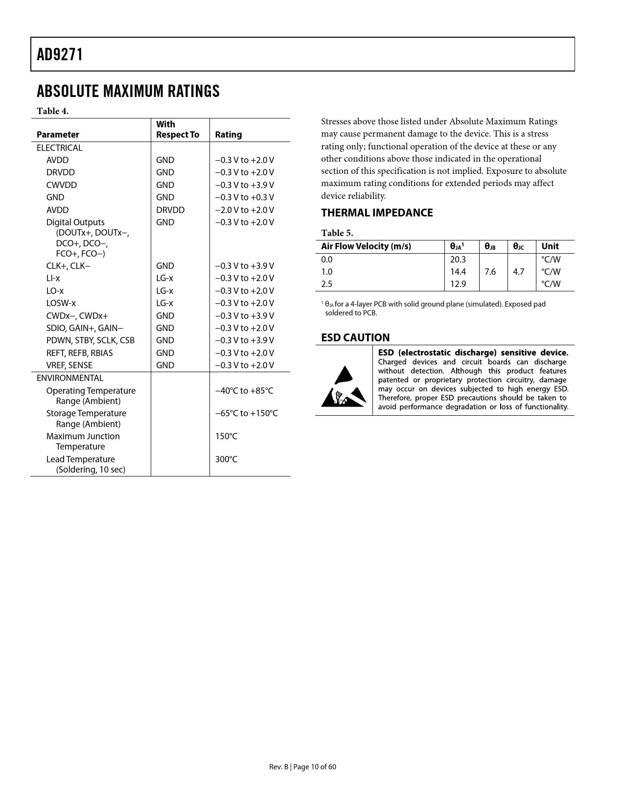 link to page 10 AD9271ABSOLUTE MAXIMUM RATINGSTable 4. Stresses above those listed under Absolute Maximum Ratings WithParameterRespect ToRating may cause permanent damage to the device. This is a stress ELECTRICAL rating only; functional operation of the device at these or any AVDD GND −0.3 V to +2.0 V other conditions above those indicated in the operational DRVDD GND −0.3 V to +2.0 V section of this specification is not implied. Exposure to absolute CWVDD GND −0.3 V to +3.9 V maximum rating conditions for extended periods may affect GND GND −0.3 V to +0.3 V device reliability. AVDD DRVDD −2.0 V to +2.0 V THERMAL IMPEDANCE Digital Outputs GND −0.3 V to +2.0 V (DOUTx+, DOUTx−, Table 5. DCO+, DCO−, Air Flow Velocity (m/s)θ 1JAθJBθJC Unit FCO+, FCO−) 0.0 20.3 °C/W CLK+, CLK− GND −0.3 V to +3.9 V 1.0 14.4 7.6 4.7 °C/W LI-x LG-x −0.3 V to +2.0 V 2.5 12.9 °C/W LO-x LG-x −0.3 V to +2.0 V LOSW-x LG-x −0.3 V to +2.0 V 1 θJA for a 4-layer PCB with solid ground plane (simulated). Exposed pad CWDx−, CWDx+ GND −0.3 V to +3.9 V soldered to PCB. SDIO, GAIN+, GAIN− GND −0.3 V to +2.0 V PDWN, STBY, SCLK, CSB GND −0.3 V to +3.9 V ESD CAUTION REFT, REFB, RBIAS GND −0.3 V to +2.0 V VREF, SENSE GND −0.3 V to +2.0 V ENVIRONMENTAL Operating Temperature −40°C to +85°C Range (Ambient) Storage Temperature −65°C to +150°C Range (Ambient) Maximum Junction 150°C Temperature Lead Temperature 300°C (Soldering, 10 sec) Rev. B | Page 10 of 60 Document Outline FEATURES APPLICATIONS GENERAL DESCRIPTION FUNCTIONAL BLOCK DIAGRAM TABLE OF CONTENTS REVISION HISTORY PRODUCT HIGHLIGHTS SPECIFICATIONS AC SPECIFICATIONS DIGITAL SPECIFICATIONS SWITCHING SPECIFICATIONS ADC TIMING DIAGRAMS ABSOLUTE MAXIMUM RATINGS THERMAL IMPEDANCE ESD CAUTION PIN CONFIGURATION AND FUNCTION DESCRIPTIONS EQUIVALENT CIRCUITS TYPICAL PERFORMANCE CHARACTERISTICS THEORY OF OPERATION ULTRASOUND CHANNEL OVERVIEW Low Noise Amplifier (LNA) Active Impedance Matching LNA Noise INPUT OVERDRIVE Input Overload Protection CW DOPPLER OPERATION Crosspoint Switch TGC OPERATION Variable Gain Amplifier Gain Control VGA Noise Antialiasing Filter ADC CLOCK INPUT CONSIDERATIONS Clock Duty Cycle Considerations Clock Jitter Considerations Power Dissipation and Power-Down Mode Digital Outputs and Timing SDIO Pin SCLK Pin CSB Pin RBIAS Pin Voltage Reference Internal Reference Operation External Reference Operation SERIAL PORT INTERFACE (SPI) HARDWARE INTERFACE MEMORY MAP READING THE MEMORY MAP TABLE RESERVED LOCATIONS DEFAULT VALUES LOGIC LEVELS APPLICATIONS INFORMATION DESIGN GUIDELINES Power and Ground Recommendations Exposed Paddle Thermal Heat Slug Recommendations EVALUATION BOARD POWER SUPPLIES INPUT SIGNALS OUTPUT SIGNALS DEFAULT OPERATION AND JUMPER SELECTION SETTINGS QUICK START PROCEDURE SCHEMATICS AND ARTWORK OUTLINE DIMENSIONS ORDERING GUIDE