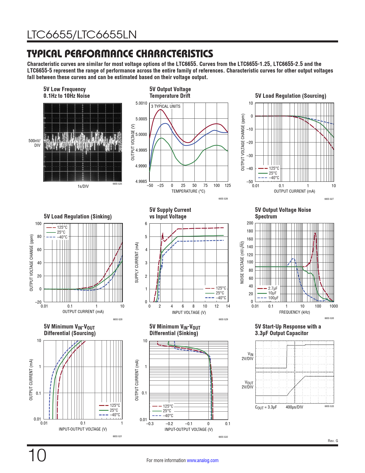 TYPICAL PERFORMANCE CHARACTERISTICS Characteristic curves are similar for most voltage options of the LTC6655. Curves from the LTC6655-1.25, LTC6655-2.5 and the LTC6655-5 represent the range of performance across the entire family of references. Characteristic curves for other output voltages fall between these curves and can be estimated based on their voltage output. 5V Low Frequency 5V Output Voltage 0.1Hz to 10Hz Noise Temperature Drift 5V Load Regulation (Sourcing)