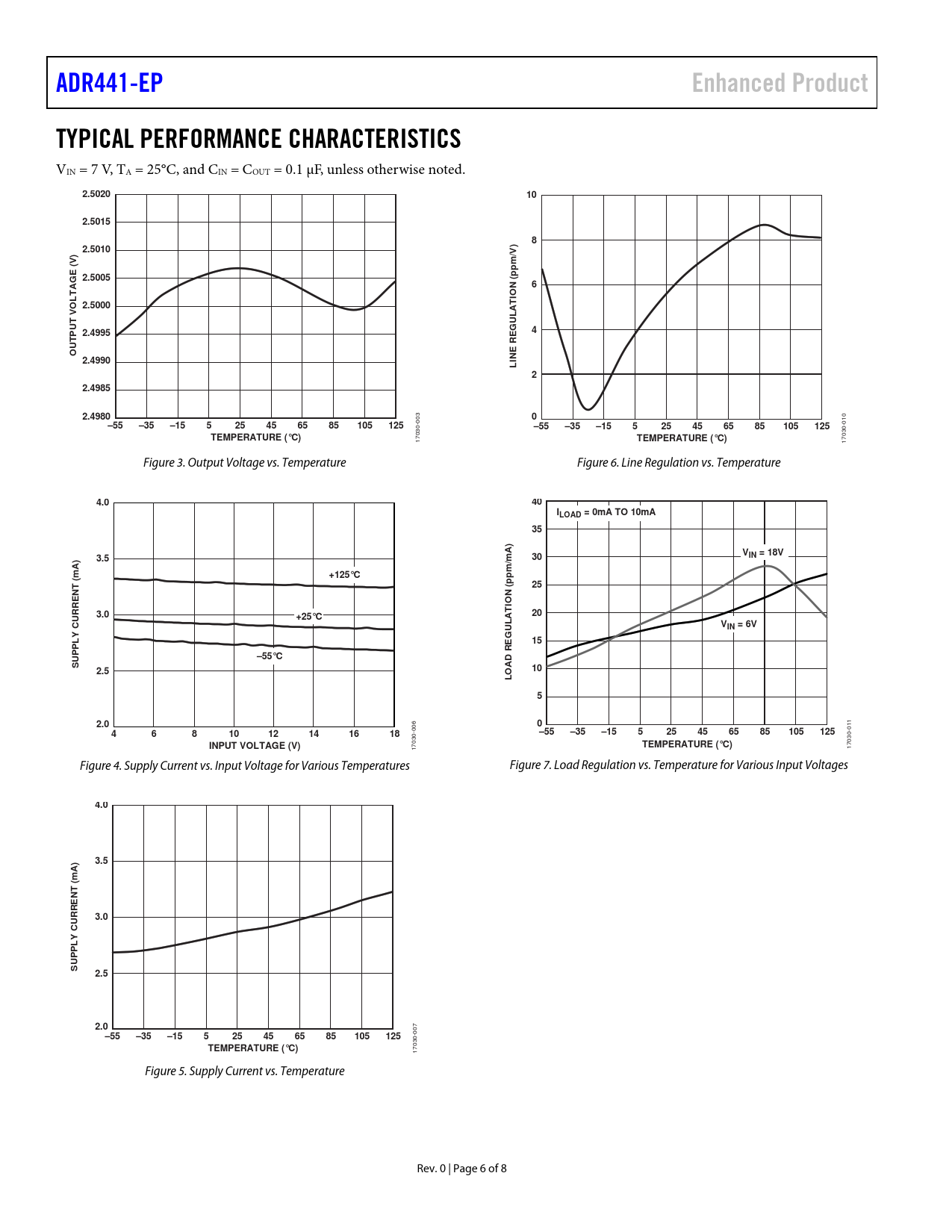 ADR441-EPEnhanced ProductTYPICAL PERFORMANCE CHARACTERISTICS VIN = 7 V, TA = 25°C, and CIN = COUT = 0.1 µF, unless otherwise noted. 2.5020102.5015)82.5010)/VV (ppmGE 2.5005(6TIONOLTA 2.5000LAT V UGU2.4995E4TPROUE2.4990LIN22.49852.49800 003 –55–35–15525456585105125 010 –55–35–15525456585105125TEMPERATURE (°C) 17030- TEMPERATURE (°C) 17030- Figure 3. Output Voltage vs. Temperature Figure 6. Line Regulation vs. Temperature 4.040ILOAD = 0mA TO 10mA35) AV3.5IN = 18V/m30mA)+125°C(ppm (25NTTION3.0+25°C20LACURREVIN = 6VYGULE15PRUP–55°CDS2.510LOA52.00 006 011 4681012141618–55–35–15525456585105125INPUT VOLTAGE (V)TEMPERATURE (°C) 17030- 17030- Figure 4. Supply Current vs. Input Voltage for Various Temperatures Figure 7. Load Regulation vs. Temperature for Various Input Voltages 4.03.5mA) ( NT3.0CURRE Y L P UP S2.52.0 007 –55–35–15525456585105125TEMPERATURE (°C) 17030- Figure 5. Supply Current vs. Temperature Rev. 0 | Page 6 of 8 Document Outline FEATURES ENHANCED PRODUCT FEATURES APPLICATIONS TYPICAL APPLICATION CIRCUIT GENERAL DESCRIPTION TABLE OF CONTENTS REVISION HISTORY SPECIFICATIONS ELECTRICAL CHARACTERISTICS ABSOLUTE MAXIMUM RATINGS THERMAL RESISTANCE ESD CAUTION PIN CONFIGURATION AND FUNCTION DESCRIPTIONS TYPICAL PERFORMANCE CHARACTERISTICS OUTLINE DIMENSIONS ORDERING GUIDE