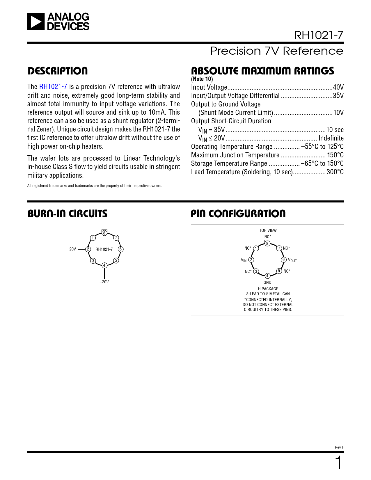 Datasheet RH1021-7 Analog Devices, 修订版: F