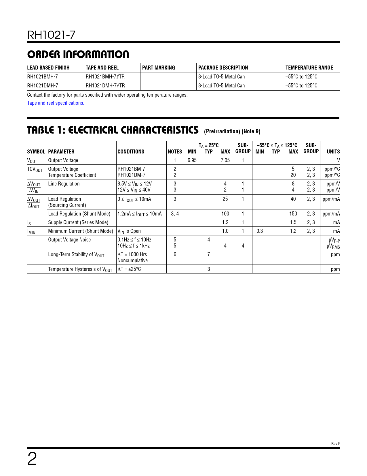 VOUT Output Voltage 1 6.95 7.05 1 V TCVOUT Output Voltage RH1021BM-7 2 5 2, 3 ppm/°C Temperature Coefficient RH1021DM-7 2 20 2, 3 ppm/°C ∆VOUT Line Regulation 8.5V ≤ VIN ≤ 12V 3 4 1 8 2, 3 ppm/V ∆VIN 12V ≤ VIN ≤ 40V 3 2 1 4 2, 3 ppm/V ∆VOUT Load Regulation 0 ≤ IOUT ≤ 10mA 3 25 1 40 2, 3 ppm/mA ∆IOUT (Sourcing Current) Load Regulation (Shunt Mode) 1.2mA ≤ IOUT ≤ 10mA 3, 4 100 1 150 2, 3 ppm/mA IS Supply Current (Series Mode) 1.2 1 1.5 2, 3 mA IMIN Minimum Current (Shunt Mode) VIN Is Open 1.0 1 0.3 1.2 2, 3 mA Output Voltage Noise 0.1Hz ≤ f ≤ 10Hz 5 4 µVP-P 10Hz ≤ f ≤ 1kHz 5 4 4 µVRMS Long-Term Stability of VOUT ∆T = 1000 Hrs 6 7 ppm Noncumulative Temperature Hysteresis of VOUT ∆T = ±25°C 3 ppm Rev F 2 Document Outline Description Absolute Maximum Ratings Burn-In Circuits Pin Configuration Order Information Table 1: Electrical Characteristics Table 1A: Electrical Characteristics Table 2: Electrical Test Requirements Total Dose Bias Circuit Revision History Typical Performance Characteristics