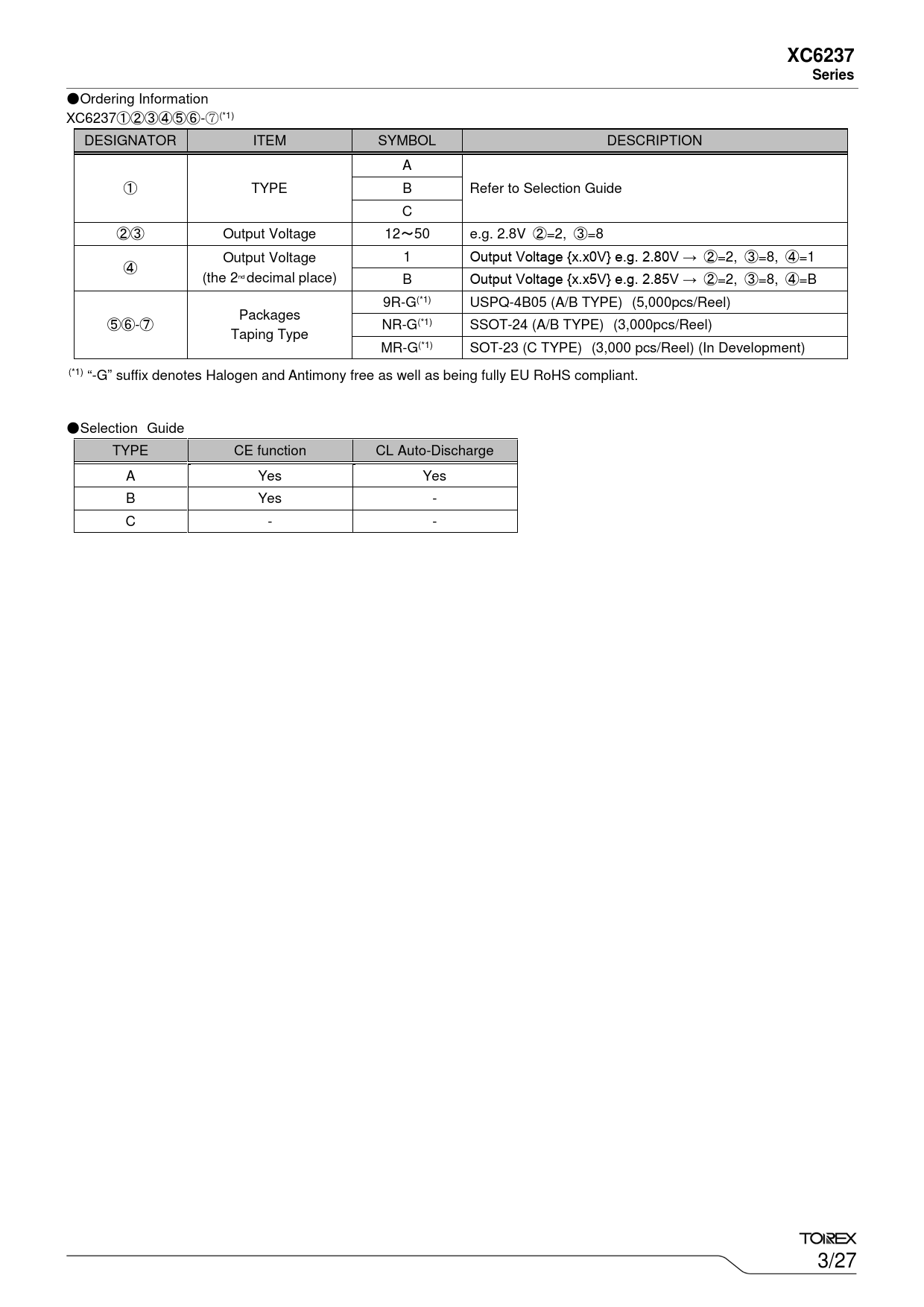 XC6237Series ●Ordering Information XC6237①②③④⑤⑥-⑦(*1) DESIGNATOR ITEM SYMBOL DESCRIPTION A ① TYPE B Refer to Selection Guide C ②③ Output Voltage 12~50 e.g. 2.8V ②=2, ③=8 Output Voltage 1 Output Voltage {x.x0V} e.g. 2.80V → ②=2, ③=8, ④=1 ④ (the 2nd decimal place) B Output Voltage {x.x5V} e.g. 2.85V → ②=2, ③=8, ④=B 9R-G(*1) USPQ-4B05 (A/B TYPE) (5,000pcs/Reel) Packages ⑤⑥-⑦ NR-G(*1) SSOT-24 (A/B TYPE) (3,000pcs/Reel) Taping Type MR-G(*1) SOT-23 (C TYPE) (3,000 pcs/Reel) (In Development) (*1) “-G” suffix denotes Halogen and Antimony free as well as being fully EU RoHS compliant. ●Selection Guide TYPE CE function CL Auto-Discharge A Yes Yes B Yes - C - - 3/27 Document Outline XC6237 (2) XC6237_ETR03100-001 XC6237 XC6237_ETR03100-001