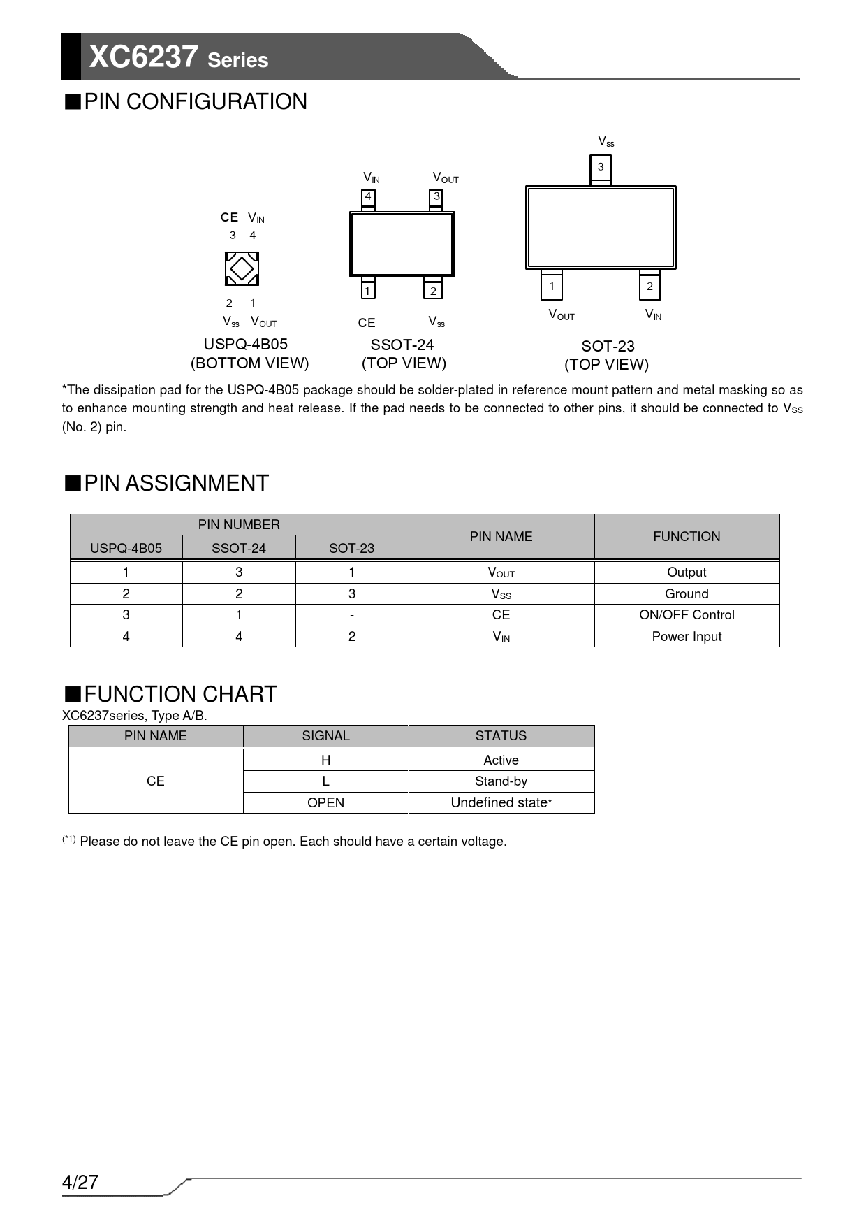 ■PIN CONFIGURATION Vss 3 VIN VOUT 4 3 CE VIN 3 4 1 2 1 2 2 1 VOUT VIN Vss VOUT CE Vss USPQ-4B05 SSOT-24 SOT-23 (BOTTOM VIEW) (TOP VIEW) (TOP VIEW) *The dissipation pad for the USPQ-4B05 package should be solder-plated in reference mount pattern and metal masking so as to enhance mounting strength and heat release. If the pad needs to be connected to other pins, it should be connected to VSS (No. 2) pin. ■PIN ASSIGNMENT PIN NUMBER PIN NAME FUNCTION USPQ-4B05 SSOT-24 SOT-23 1 3 1 VOUT Output 2 2 3 VSS Ground 3 1 - CE ON/OFF Control 4 4 2 VIN Power Input ■FUNCTION CHART XC6237series, Type A/B. PIN NAME SIGNAL STATUS H Active CE L Stand-by OPEN Undefined state* (*1) Please do not leave the CE pin open. Each should have a certain voltage. 4/27 Document Outline XC6237 (2) XC6237_ETR03100-001 XC6237 XC6237_ETR03100-001