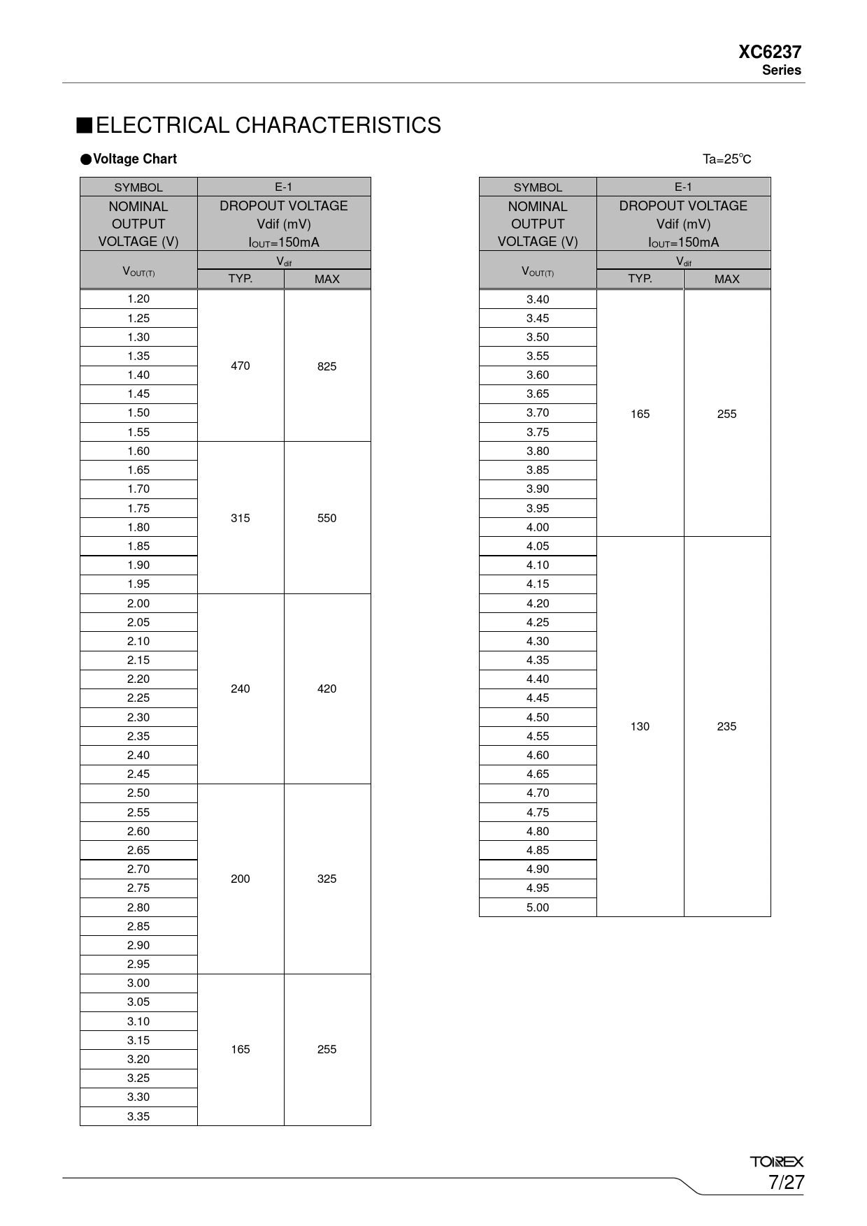 Ta=25℃ SYMBOL E-1 SYMBOL E-1 NOMINAL DROPOUT VOLTAGE NOMINAL DROPOUT VOLTAGE OUTPUT Vdif (mV) OUTPUT Vdif (mV) VOLTAGE (V) IOUT=150mA VOLTAGE (V) IOUT=150mA Vdif Vdif V OUT(T) VOUT(T) TYP. MAX TYP. MAX 1.20 3.40 1.25 3.45 1.30 3.50 1.35 3.55 470 825 1.40 3.60 1.45 3.65 1.50 3.70 165 255 1.55 3.75 1.60 3.80 1.65 3.85 1.70 3.90 1.75 3.95 315 550 1.80 4.00 1.85 4.05 1.90 4.10 1.95 4.15 2.00 4.20 2.05 4.25 2.10 4.30 2.15 4.35 2.20 4.40 240 420 2.25 4.45 2.30 4.50 130 235 2.35 4.55 2.40 4.60 2.45 4.65 2.50 4.70 2.55 4.75 2.60 4.80 2.65 4.85 2.70 4.90 200 325 2.75 4.95 2.80 5.00 2.85 2.90 2.95 3.00 3.05 3.10 3.15 165 255 3.20 3.25 3.30 3.35 7/27 Document Outline XC6237 (2) XC6237_ETR03100-001 XC6237 XC6237_ETR03100-001