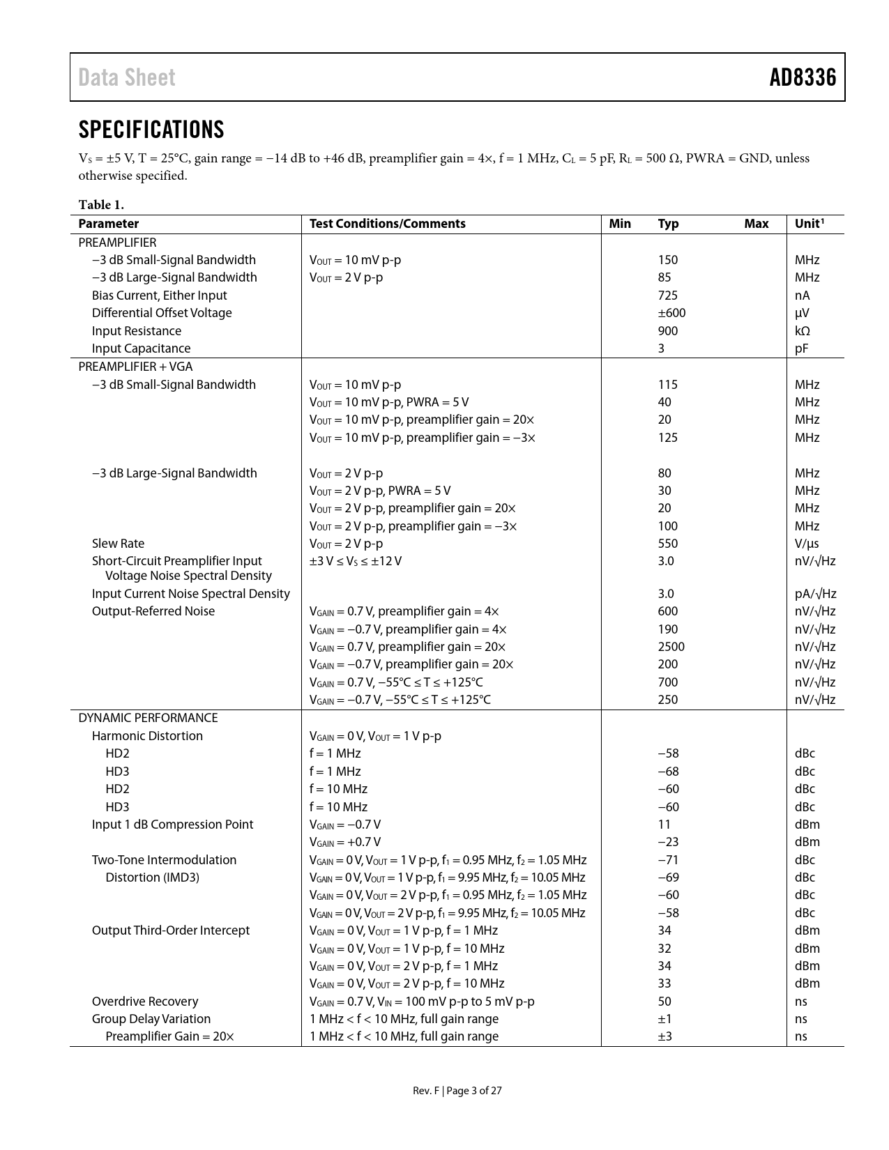 | 页数 / 页 | 27 / 3 — Data Sheet. AD8336. SPECIFICATIONS. Table 1. Parameter. Test … |