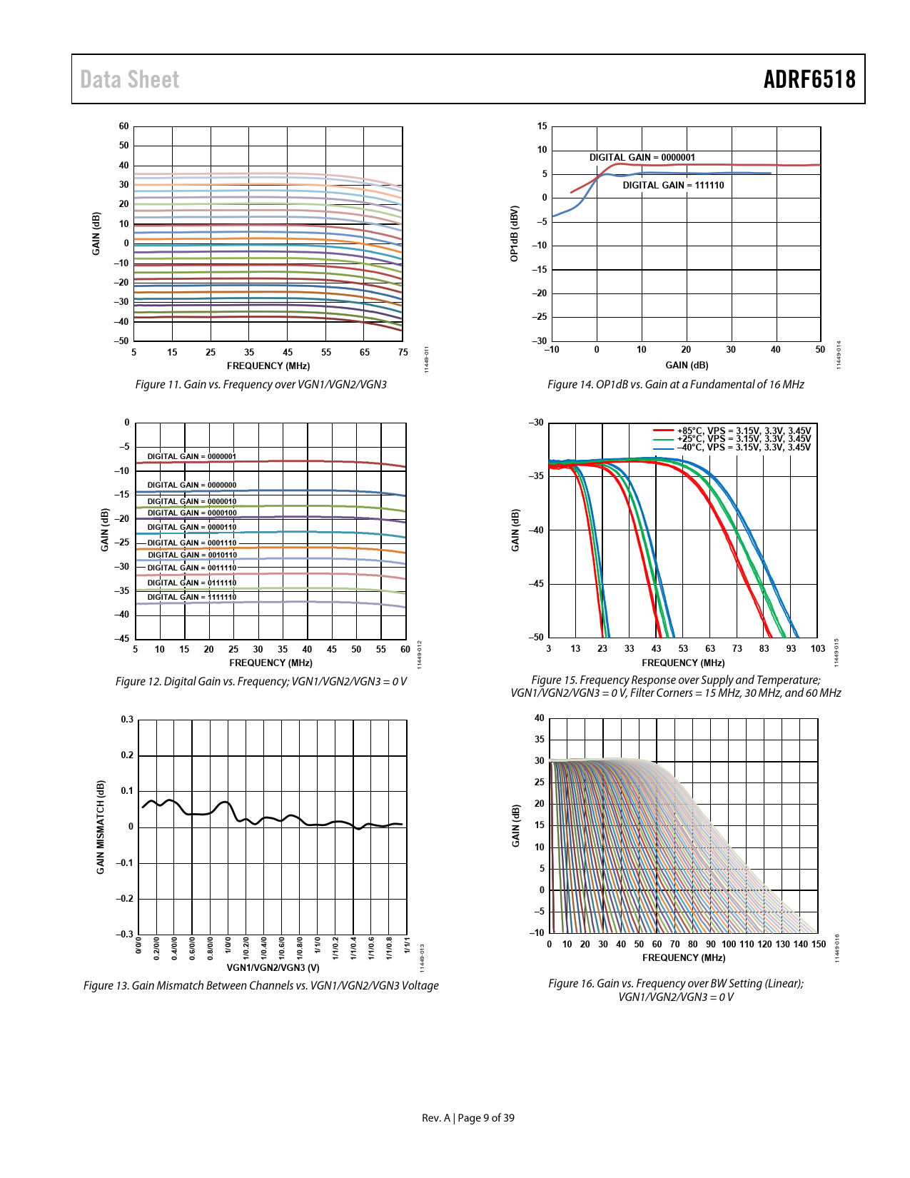11449- 1144 Figure 12. Digital Gain vs. Frequency; VGN1/VGN2/VGN3 = 0 V Figure 15. Frequency Response over Supply and Temperature; VGN1/VGN2/VGN3 = 0 V, Filter Corners = 15 MHz, 30 MHz, and 60 MHz