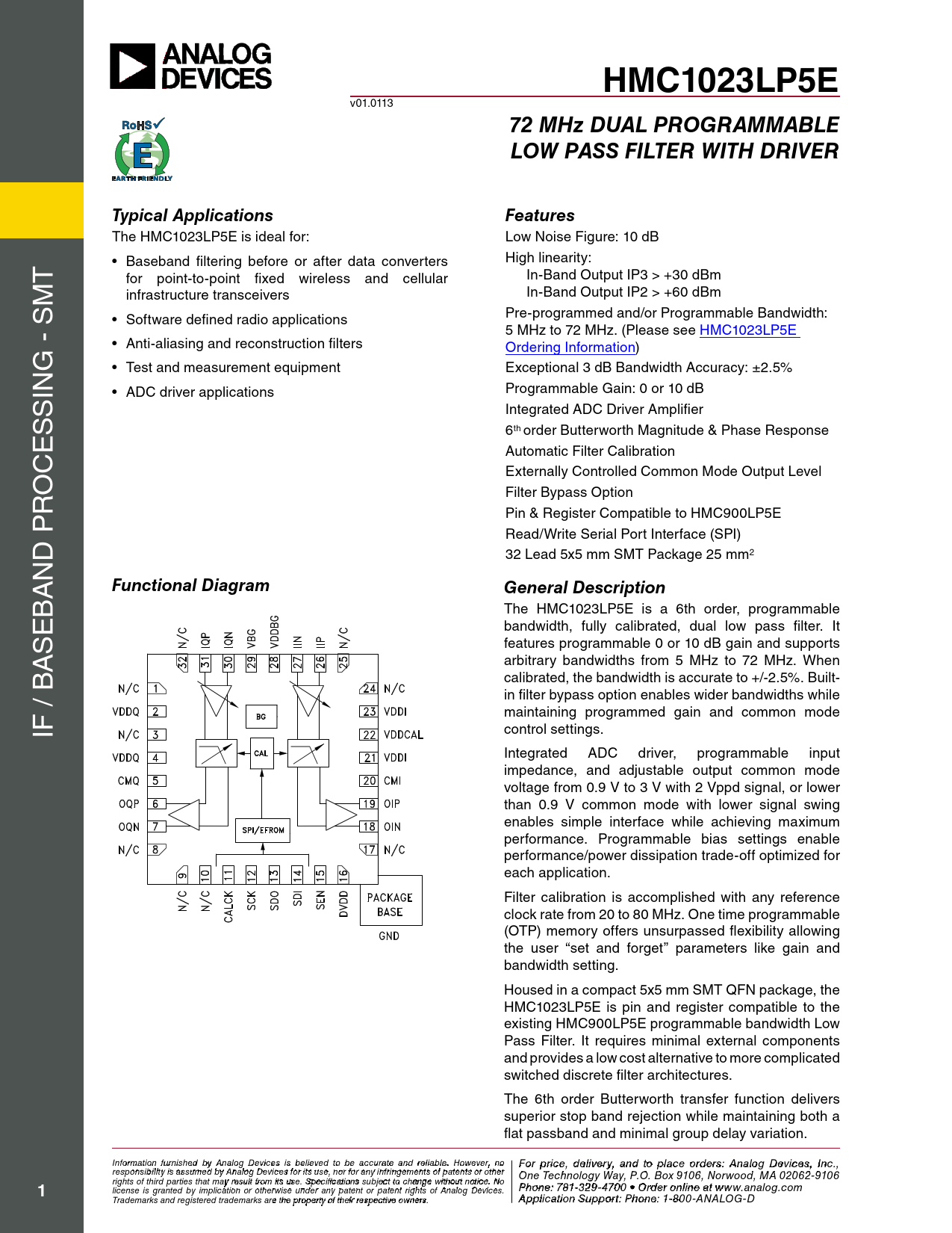 B The HMC1023LP5E is a 6th order, programmable E bandwidth, ful y calibrated, dual low pass filter. It S features programmable 0 or 10 dB gain and supports A arbitrary bandwidths from 5 MHz to 72 MHz. When calibrated, the bandwidth is accurate to +/-2.5%. Built- in filter bypass option enables wider bandwidths while maintaining programmed gain and common mode IF / B control settings. Integrated ADC driver, programmable input impedance, and adjustable output common mode voltage from 0.9 V to 3 V with 2 Vppd signal, or lower than 0.9 V common mode with lower signal swing enables simple interface while achieving maximum performance. Programmable bias settings enable performance/power dissipation trade-off optimized for each application. Filter calibration is accomplished with any reference clock rate from 20 to 80 MHz. One time programmable (OTP) memory offers unsurpassed flexibility al owing the user “set and forget” parameters like gain and bandwidth setting. Housed in a compact 5x5 mm SMT QFN package, the HMC1023LP5E is pin and register compatible to the existing HMC900LP5E programmable bandwidth Low Pass Filter. It requires minimal external components and provides a low cost alternative to more complicated switched discrete filter architectures. The 6th order Butterworth transfer function delivers superior stop band rejection while maintaining both a flat passband and minimal group delay variation. Inf F or o m r p atio r n ifc ur e n , d ishe e d lbiv y e A r n y a alog n D d t evic o p es is la beclie o eved rd to ebre sa: H ccur iattti e tae M nd re ilicarbloew . H a o ve C wever, o n rp o For price, delivery, and to place orders: Analog Devices, Inc., responsibility is assumed by Analog Devices for its use, nor for any infringements of patents or other oration, 2 Elizabeth Drive, Chelmsford, MA 01824 One Technology Way, P.O. Box 9106, Norwood, MA 02062-9106