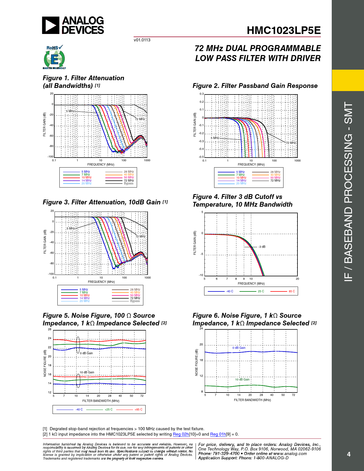 HMC1023LP5E v01.0113 72 MHz DUAL PROGRAMMABLELOW PASS FILTER WITH DRIVERFigure 1. Filter Attenuation(all Bandwidths) [1]Figure 2. Filter Passband Gain Response 20 0.3 0.2 0 0.1 T 5 MHz -20 0 M 72 MHz -40 -0.1 -0.2 FILTER GAIN (dB) -60 FILTER GAIN (dB) 5 MHz -0.3 72 MHz G - S -80 -0.4 IN -100 -0.5 0.1 1 10 100 1000 0.1 1 10 100 1000 S FREQUENCY (MHz) FREQUENCY (MHz) S 5 MHz 28 MHz 5 MHz 28 MHz 7 MHz 40 MHz E 7 MHz 40 MHz 10 MHz 50 MHz 10 MHz 50 MHz 14 MHz 72 MHz 14 MHz 72 MHz C 20 MHz Bypass 20 MHz O Figure 4. Filter 3 dB Cutoff vs R Figure 3. Filter Attenuation, 10dB Gain [1]Temperature, 10 MHz Bandwidth 20 5 D P 0 N 5 MHz A -20 0 72 MHz B -40 E -3 dB S FILTER GAIN (dB) -60 FILTER GAIN (dB) -5 A -80 -100 -10 0.1 1 10 100 1000 5 6 7 8 9 10 20 FREQUENCY (MHz) IF / B FREQUENCY (MHz) 5 MHz 28 MHz 7 MHz 40 MHz -40 C 25 C 85 C 10 MHz 50 MHz 14 MHz 72 MHz 20 MHz Bypass Figure 5. Noise Figure, 100 Ω SourceFigure 6. Noise Figure, 1 k Ω SourceImpedance, 1 k Ω Impedance Selected [2]Impedance, 1 k Ω Impedance Selected [2] 26 24 24 20 22 0 dB Gain 0 dB Gain 20 16 18 16 10 dB Gain NOISE FIGURE (dB) NOISE FIGURE (dB) 12 10 dB Gain 14 12 8 5 7 10 14 20 28 40 50 72 5 7 10 14 20 28 40 50 72 FILTER BANDWIDTH (MHz) FILTER BANDWIDTH (MHz) -40 C +25 C +85 C [1] Degrated stop-band rejection at frequencies > 100 MHz caused by the test fixture. [2] 1 kΩ input impedance into the HMC1023LP5E selected by writing Reg 02h[10]=0 and Reg 01h[9] = 0. Inf F or o m r p atio r n ifc ur e n , d ishe e d lbiv y e A r n y a alog n D d t evic o p es is la beclie o eved rd to ebre sa: H ccur iattti e tae M nd re ilicarbloew . H a o ve C wever, o n rp o For price, delivery, and to place orders: Analog Devices, Inc., responsibility is assumed by Analog Devices for its use, nor for any infringements of patents or other oration, 2 Elizabeth Drive, Chelmsford, MA 01824 One Technology Way, P.O. Box 9106, Norwood, MA 02062-9106 Phone: 978-250-3343 Fax: 978-250-3373 O rights of third parties that may result from its use. Specifications subject to change without notice. No P rd hone e r O : 7 n 81- -3li 2n 9 e a -47 t w 0 w 0 • O w rd .h e it r o t niltie n .c e ao t m license is granted by implication or otherwise under any patent or patent rights of Analog Devices. www.analog.com 4 Application Support: Pho Trademarks and registered trademarks are the property of their respective owners. ne: 978-250-33 A 4 p 3 p o lica rti a o p n S p u s p @ po h rt itt : P ite ho . n c e om : 1-800-ANALOG-D