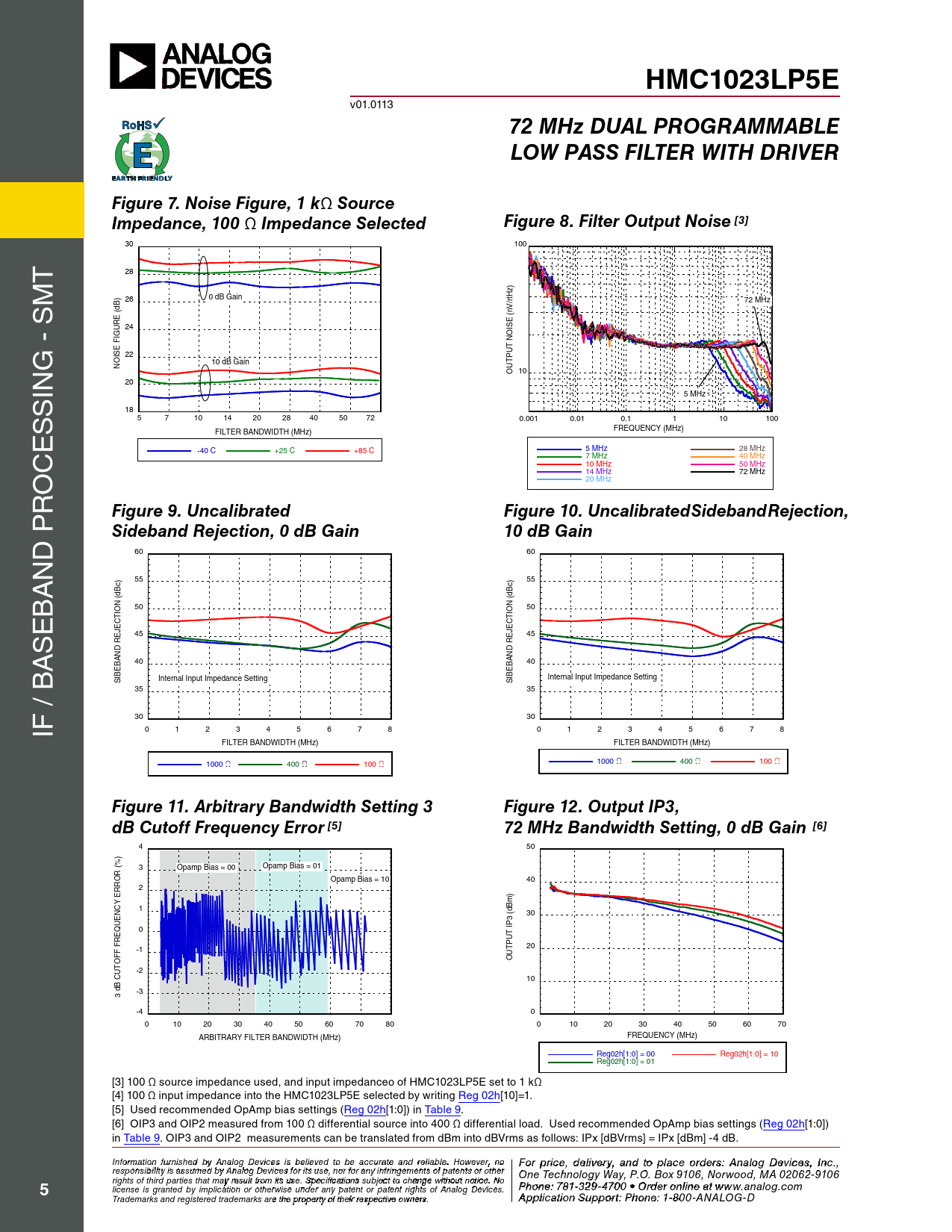 HMC1023LP5E v01.0113 72 MHz DUAL PROGRAMMABLELOW PASS FILTER WITH DRIVERFigure 7. Noise Figure, 1 k Ω SourceImpedance, 100 Ω Impedance SelectedFigure 8. Filter Output Noise [3] 30 100 T 28 M 26 0 dB Gain 72 MHz 24 G - S 22 NOISE FIGURE (dB) 10 dB Gain OUTPUT NOISE (nV/rtHz) 10 IN 20 S 5 MHz S 18 5 7 10 14 20 28 40 50 72 0.001 0.01 0.1 1 10 100 E FILTER BANDWIDTH (MHz) FREQUENCY (MHz) C -40 C +25 C +85 C 5 MHz 28 MHz 7 MHz 40 MHz 10 MHz 50 MHz O 14 MHz 72 MHz 20 MHz R Figure 9. UncalibratedFigure 10. Uncalibrated Sideband Rejection,Sideband Rejection, 0 dB Gain10 dB Gain D P 60 60 N A 55 55 B dBc) dBc) 50 50 E S 45 45 A 40 40 SIBEBAND REJECTION ( Internal Input Impedance Setting SIBEBAND REJECTION ( Internal Input Impedance Setting 35 35 IF / B 30 30 0 1 2 3 4 5 6 7 8 0 1 2 3 4 5 6 7 8 FILTER BANDWIDTH (MHz) FILTER BANDWIDTH (MHz) 1000 W 400 W 100 W 1000 W 400 W 100 W Figure 11. Arbitrary Bandwidth Setting 3Figure 12. Output IP3,dB Cutoff Frequency Error [5]72 MHz Bandwidth Setting, 0 dB Gain [6] 4 50 3 Opamp Bias = 00 Opamp Bias = 01 Opamp Bias = 10 40 2 1 30 0 20 -1 OUTPUT IP3 (dBm) -2 CUTOFF FREQUENCY ERROR (%) 10 B -3 3 d -4 0 0 10 20 30 40 50 60 70 80 0 10 20 30 40 50 60 70 FREQUENCY (MHz) ARBITRARY FILTER BANDWIDTH (MHz) Reg02h[1:0] = 00 Reg02h[1:0] = 10 Reg02h[1:0] = 01 [3] 100 Ω source impedance used, and input impedanceo of HMC1023LP5E set to 1 kΩ [4] 100 Ω input impedance into the HMC1023LP5E selected by writing Reg 02h[10]=1. [5] Used recommended OpAmp bias settings (Reg 02h[1:0]) in Table 9. [6] OIP3 and OIP2 measured from 100 Ω differential source into 400 Ω differential load. Used recommended OpAmp bias settings (Reg 02h[1:0]) in Table 9. OIP3 and OIP2 measurements can be translated from dBm into dBVrms as follows: IPx [dBVrms] = IPx [dBm] -4 dB. Inf F or o m r p atio r n ifc ur e n , d ishe e d lbiv y e A r n y a alog n D d t evic o p es is la beclie o eved rd to ebre sa: H ccur iattti e tae M nd re ilicarbloew . H a o ve C wever, o n rp o For price, delivery, and to place orders: Analog Devices, Inc., responsibility is assumed by Analog Devices for its use, nor for any infringements of patents or other oration, 2 Elizabeth Drive, Chelmsford, MA 01824 One Technology Way, P.O. Box 9106, Norwood, MA 02062-9106 5 Phone: 978-250-3343 Fax: 978-250-3373 O rights of third parties that may result from its use. Specifications subject to change without notice. No P rd hone e r O : 7 n 81- -3li 2n 9 e a -47 t w 0 w 0 • O w rd .h e it r o t niltie n .c e ao t m license is granted by implication or otherwise under any patent or patent rights of Analog Devices. www.analog.com Application Support: Pho Trademarks and registered trademarks are the property of their respective owners. ne: 978-250-33 A 4 p 3 p o lica rti a o p n S p u s p @ po h rt itt : P ite ho . n c e om : 1-800-ANALOG-D