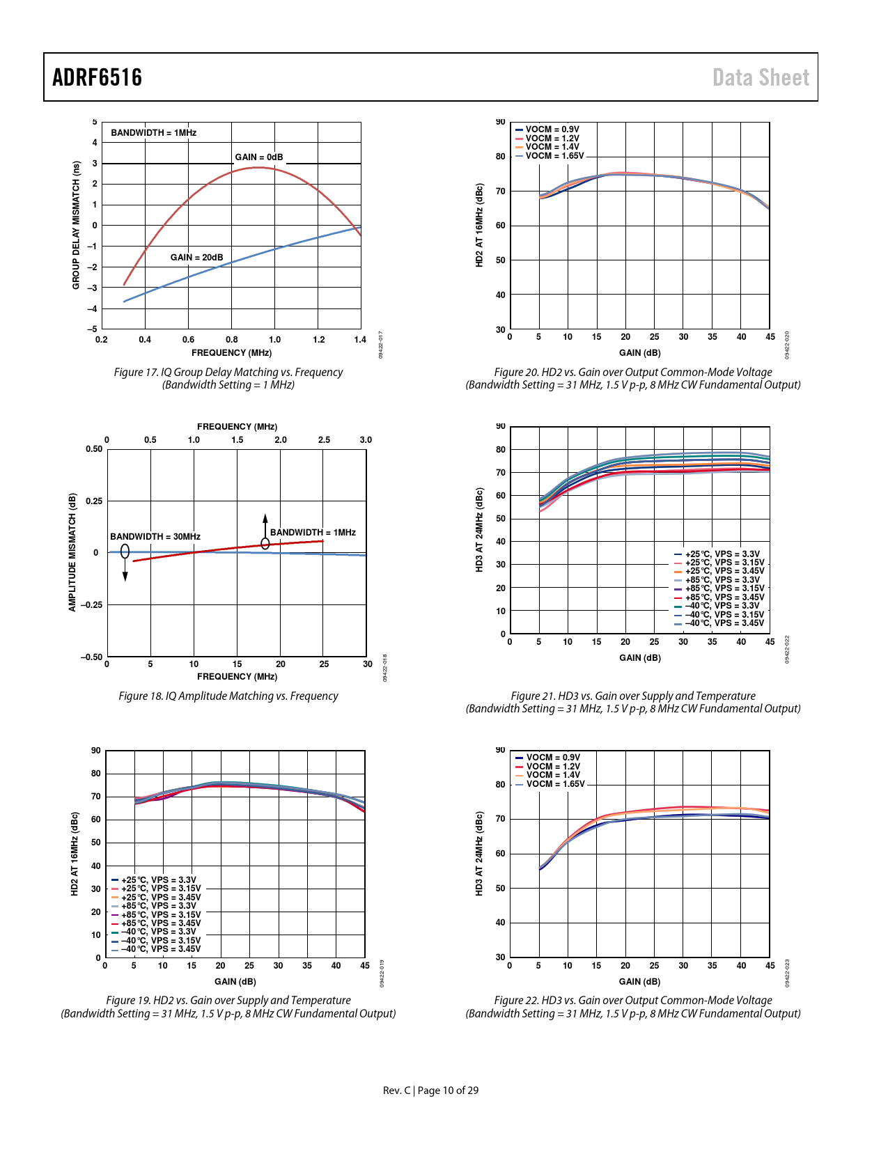 09422- 09422- Figure 17. IQ Group Delay Matching vs. Frequency Figure 20. HD2 vs. Gain over Output Common-Mode Voltage (Bandwidth Setting = 1 MHz) (Bandwidth Setting = 31 MHz, 1.5 V p-p, 8 MHz CW Fundamental Output)