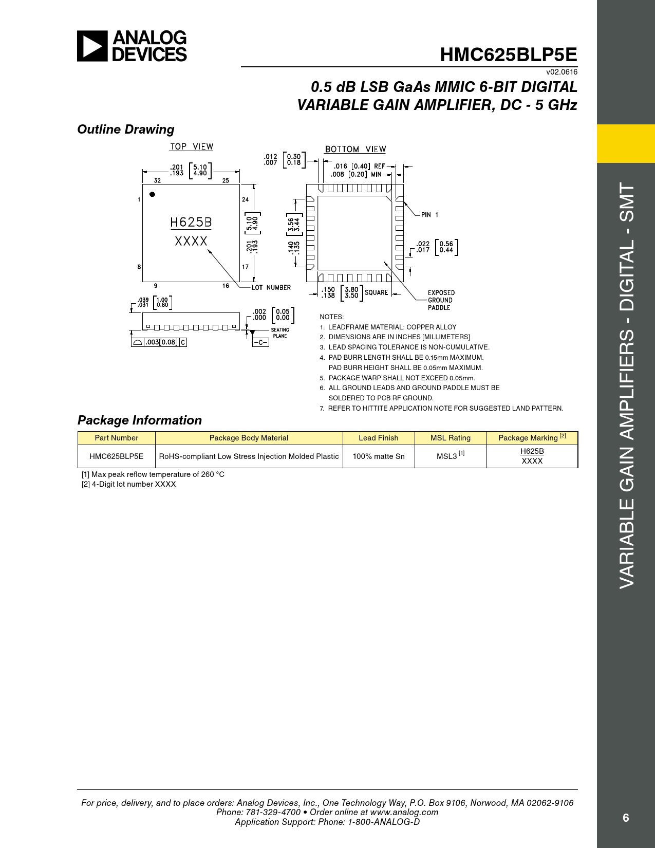 HMC625BLP5E. 0.5 dB LSB GaAs MMIC 6-BIT DIGITAL. VARIABLE GAIN AMPLIFIER, DC - 5 GHz. Outline Drawing. Package Information
