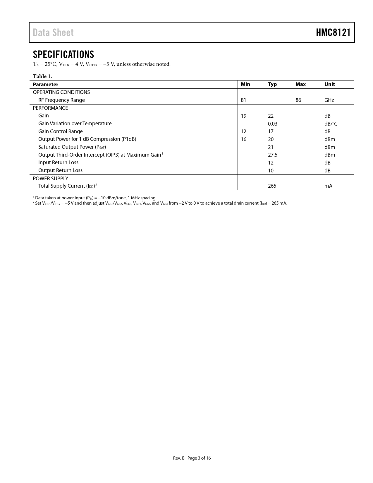 页数 / 页16 / 3 — Data Sheet. HMC8121. SPECIFICATIONS. Table 1. Parameter. Min. Typ. Max. …