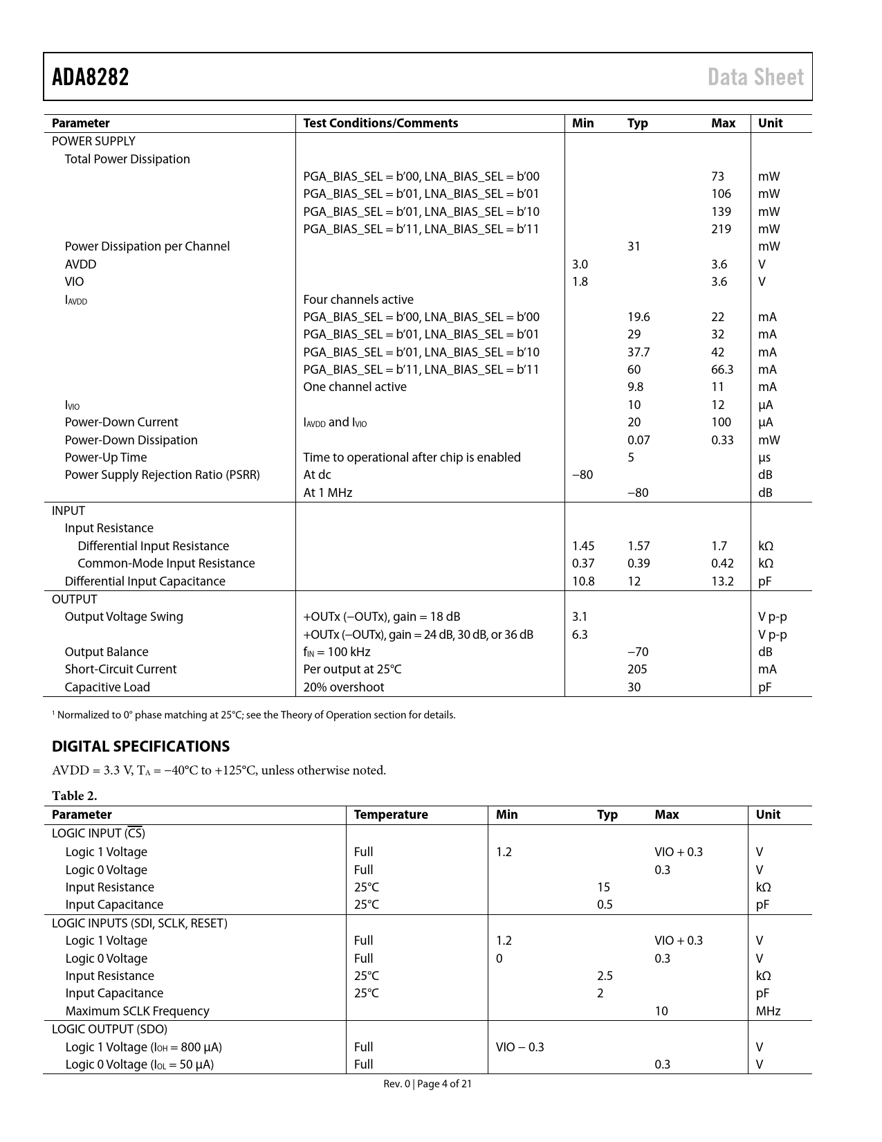 link to page 11 ADA8282Data SheetParameter TestConditions/CommentsMinTypMaxUnit POWER SUPPLY Total Power Dissipation PGA_BIAS_SEL = b’00, LNA_BIAS_SEL = b’00 73 mW PGA_BIAS_SEL = b’01, LNA_BIAS_SEL = b’01 106 mW PGA_BIAS_SEL = b’01, LNA_BIAS_SEL = b’10 139 mW PGA_BIAS_SEL = b’11, LNA_BIAS_SEL = b’11 219 mW Power Dissipation per Channel 31 mW AVDD 3.0 3.6 V VIO 1.8 3.6 V IAVDD Four channels active PGA_BIAS_SEL = b’00, LNA_BIAS_SEL = b’00 19.6 22 mA PGA_BIAS_SEL = b’01, LNA_BIAS_SEL = b’01 29 32 mA PGA_BIAS_SEL = b’01, LNA_BIAS_SEL = b’10 37.7 42 mA PGA_BIAS_SEL = b’11, LNA_BIAS_SEL = b’11 60 66.3 mA One channel active 9.8 11 mA IVIO 10 12 μA Power-Down Current IAVDD and IVIO 20 100 μA Power-Down Dissipation 0.07 0.33 mW Power-Up Time Time to operational after chip is enabled 5 μs Power Supply Rejection Ratio (PSRR) At dc −80 dB At 1 MHz −80 dB INPUT Input Resistance Differential Input Resistance 1.45 1.57 1.7 kΩ Common-Mode Input Resistance 0.37 0.39 0.42 kΩ Differential Input Capacitance 10.8 12 13.2 pF OUTPUT Output Voltage Swing +OUTx (−OUTx), gain = 18 dB 3.1 V p-p +OUTx (−OUTx), gain = 24 dB, 30 dB, or 36 dB 6.3 V p-p Output Balance fIN = 100 kHz −70 dB Short-Circuit Current Per output at 25°C 205 mA Capacitive Load 20% overshoot 30 pF 1 Normalized to 0° phase matching at 25°C; see the Theory of Operation section for details. DIGITAL SPECIFICATIONS AVDD = 3.3 V, TA = −40°C to +125°C, unless otherwise noted. Table 2. Parameter TemperatureMinTypMaxUnit LOGIC INPUT (CS) Logic 1 Voltage Full 1.2 VIO + 0.3 V Logic 0 Voltage Full 0.3 V Input Resistance 25°C 15 kΩ Input Capacitance 25°C 0.5 pF LOGIC INPUTS (SDI, SCLK, RESET) Logic 1 Voltage Full 1.2 VIO + 0.3 V Logic 0 Voltage Full 0 0.3 V Input Resistance 25°C 2.5 kΩ Input Capacitance 25°C 2 pF Maximum SCLK Frequency 10 MHz LOGIC OUTPUT (SDO) Logic 1 Voltage (IOH = 800 μA) Full VIO − 0.3 V Logic 0 Voltage (IOL = 50 μA) Full 0.3 V Rev. 0 | Page 4 of 21 Document Outline FEATURES APPLICATIONS FUNCTIONAL BLOCK DIAGRAM GENERAL DESCRIPTION REVISION HISTORY SPECIFICATIONS DIGITAL SPECIFICATIONS ABSOLUTE MAXIMUM RATINGS THERMAL RESISTANCE ESD CAUTION PIN CONFIGURATION AND FUNCTION DESCRIPTIONS TYPICAL PERFORMANCE CHARACTERISTICS THEORY OF OPERATION RADAR RECEIVE PATH AFE DEFAULT SPI SETTINGS INPUT IMPEDANCE POWER MODES PROGRAMMABLE GAIN RANGE OUTPUT SWING VARIATION WITH GAIN OFFSET VOLTAGE ADJUSTMENTS VIO Pin SINGLE-ENDED OR DIFFERENTIAL INPUT SHORT-CIRCUIT CURRENTS SPI INTERFACE CHANNEL TO CHANNEL PHASE MATCHING APPLICATIONS INFORMATION INCREASED GAIN USING TWO ADA8282 DEVICES IN SERIES MULTIPLEXING INPUTS USING MULTIPLE ADA8282 DEVICES BASIC CONNECTIONS FOR A TYPICAL APPLICATION REGISTER MAP REGISTER SUMMARY REGISTER DETAILS Register 0x00: Interface Configuration Register Register 0x01: Soft Reset Register Register 0x04: Chip ID Low Register Register 0x05: Chip ID High Register Register 0x06: Revision Register Register 0x10: LNA Offset 0 Register Register 0x11: LNA Offset 1 Register Register 0x12: LNA Offset 2 Register Register 0x13: LNA Offset 3 Register Register 0x14: PGA Bias Register Register 0x15: PGA Gain Register Register 0x17: Enable Channel Register Register 0x18: Enable Bias Generator Register Register 0x1D: GPIO Write Register Register 0x1E: GPIO Read Register OUTLINE DIMENSIONS ORDERING GUIDE AUTOMOTIVE PRODUCTS