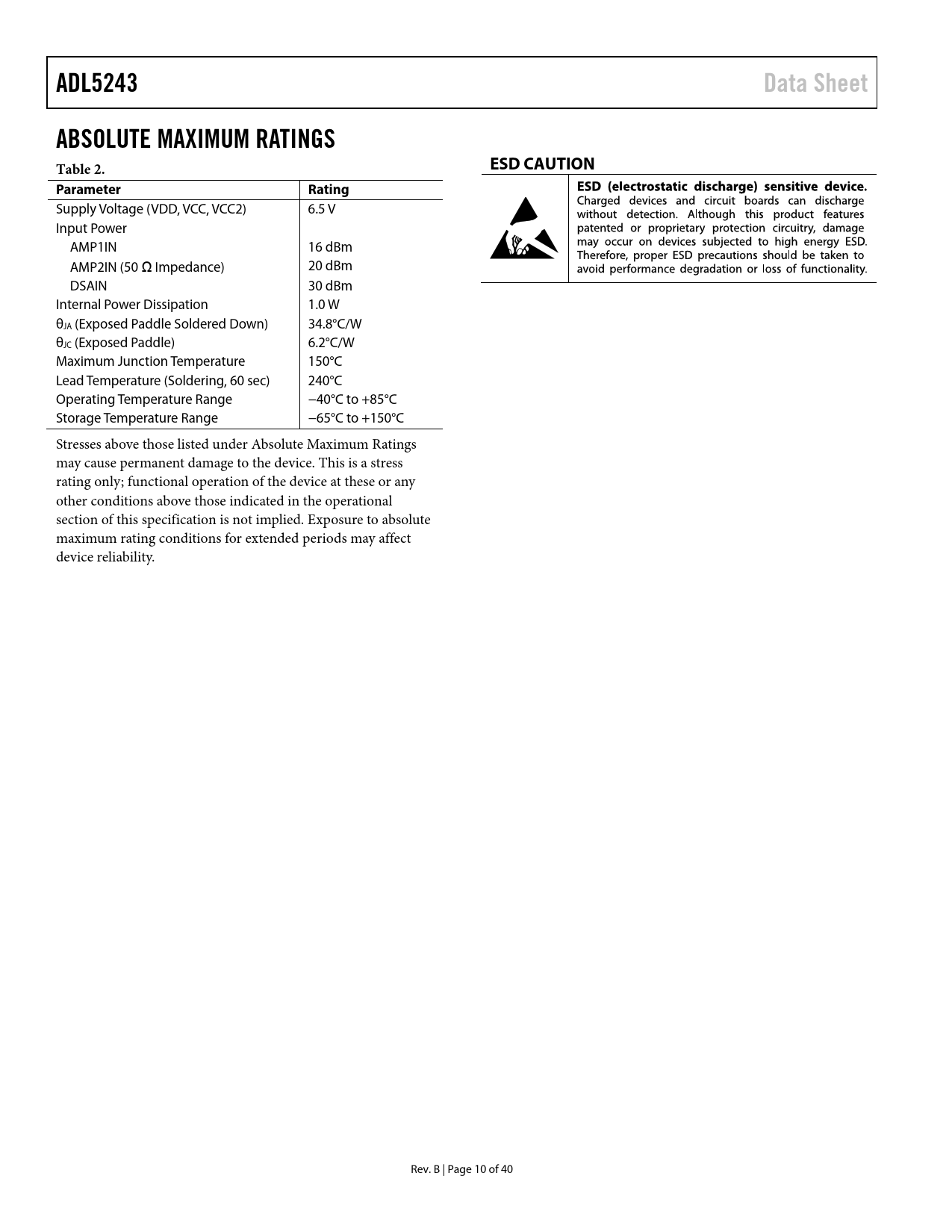 页数 / 页40 / 10 — ADL5243. Data Sheet. ABSOLUTE MAXIMUM RATINGS Table 2. ESD CAUTION. …