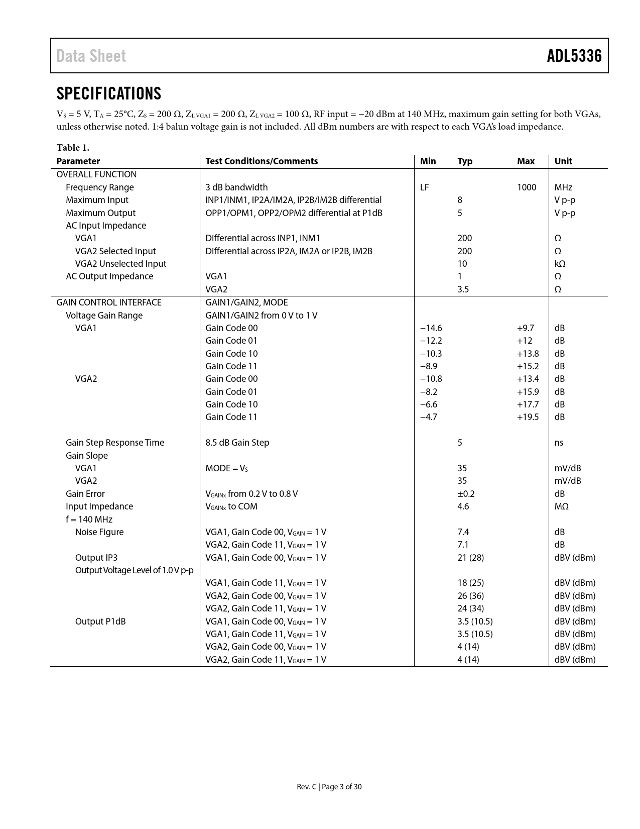 Data SheetADL5336SPECIFICATIONS VS = 5 V, TA = 25°C, ZS = 200 Ω, ZL VGA1 = 200 Ω, ZL VGA2 = 100 Ω, RF input = −20 dBm at 140 MHz, maximum gain setting for both VGAs, unless otherwise noted. 1:4 balun voltage gain is not included. All dBm numbers are with respect to each VGA’s load impedance. Table 1. ParameterTest Conditions/CommentsMinTypMaxUnit OVERALL FUNCTION Frequency Range 3 dB bandwidth LF 1000 MHz Maximum Input INP1/INM1, IP2A/IM2A, IP2B/IM2B differential 8 V p-p Maximum Output OPP1/OPM1, OPP2/OPM2 differential at P1dB 5 V p-p AC Input Impedance VGA1 Differential across INP1, INM1 200 Ω VGA2 Selected Input Differential across IP2A, IM2A or IP2B, IM2B 200 Ω VGA2 Unselected Input 10 kΩ AC Output Impedance VGA1 1 Ω VGA2 3.5 Ω GAIN CONTROL INTERFACE GAIN1/GAIN2, MODE Voltage Gain Range GAIN1/GAIN2 from 0 V to 1 V VGA1 Gain Code 00 −14.6 +9.7 dB Gain Code 01 −12.2 +12 dB Gain Code 10 −10.3 +13.8 dB Gain Code 11 −8.9 +15.2 dB VGA2 Gain Code 00 −10.8 +13.4 dB Gain Code 01 −8.2 +15.9 dB Gain Code 10 −6.6 +17.7 dB Gain Code 11 −4.7 +19.5 dB Gain Step Response Time 8.5 dB Gain Step 5 ns Gain Slope VGA1 MODE = VS 35 mV/dB VGA2 35 mV/dB Gain Error VGAINx from 0.2 V to 0.8 V ±0.2 dB Input Impedance VGAINx to COM 4.6 MΩ f = 140 MHz Noise Figure VGA1, Gain Code 00, VGAIN = 1 V 7.4 dB VGA2, Gain Code 11, VGAIN = 1 V 7.1 dB Output IP3 VGA1, Gain Code 00, VGAIN = 1 V 21 (28) dBV (dBm) Output Voltage Level of 1.0 V p-p VGA1, Gain Code 11, VGAIN = 1 V 18 (25) dBV (dBm) VGA2, Gain Code 00, VGAIN = 1 V 26 (36) dBV (dBm) VGA2, Gain Code 11, VGAIN = 1 V 24 (34) dBV (dBm) Output P1dB VGA1, Gain Code 00, VGAIN = 1 V 3.5 (10.5) dBV (dBm) VGA1, Gain Code 11, VGAIN = 1 V 3.5 (10.5) dBV (dBm) VGA2, Gain Code 00, VGAIN = 1 V 4 (14) dBV (dBm) VGA2, Gain Code 11, VGAIN = 1 V 4 (14) dBV (dBm) Rev. C | Page 3 of 30 Document Outline FEATURES APPLICATIONS FUNCTIONAL BLOCK DIAGRAM GENERAL DESCRIPTION TABLE OF CONTENTS REVISION HISTORY SPECIFICATIONS TIMING DIAGRAMS ABSOLUTE MAXIMUM RATINGS ESD CAUTION PIN CONFIGURATION AND FUNCTION DESCRIPTIONS TYPICAL PERFORMANCE CHARACTERISTICS THEORY OF OPERATION CIRCUIT DESCRIPTION GAIN CONTROL INTERFACE INPUT AND OUTPUT IMPEDANCES AGC OPERATION REGISTER MAP AND CODES APPLICATIONS INFORMATION BASIC CONNECTIONS SUPPLY DECOUPLING INPUT SIGNAL PATH OUTPUT SIGNAL PATH DETECTOR OUTPUT AND GAIN PIN COMMON-MODE BYPASSING SERIAL PORT CONNECTIONS MODE AND ENABLE CONNECTIONS ERROR VECTOR MAGNITUDE (EVM) EFFECT OF CAGC ON EVM AGC INSENSITIVITY TO MODULATION TYPE EFFECT OF SETPOINT ON EVM CASCADED VGA/AGC PERFORMANCE EVALUATION BOARD LAYOUT BILL OF MATERIALS (BOM) EVALUATION BOARD CONTROL SOFTWARE OUTLINE DIMENSIONS ORDERING GUIDE