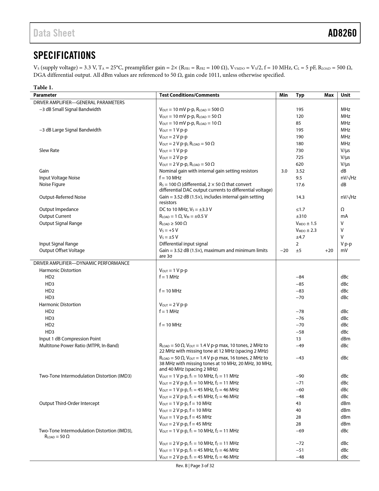 | 页数 / 页 | 32 / 3 — Data Sheet. AD8260. SPECIFICATIONS. Table 1. Parameter. Test … |