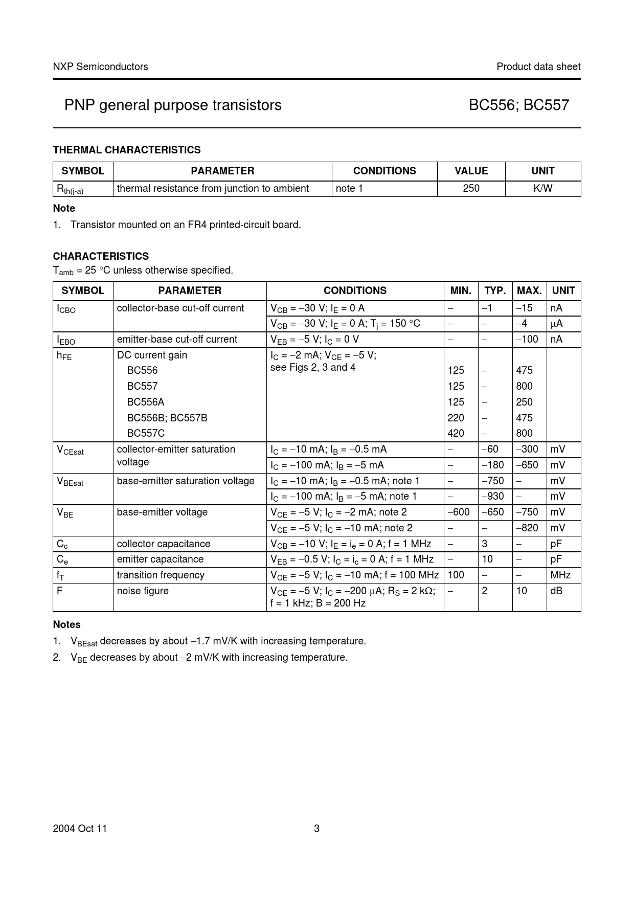 link to page 3 link to page 4 link to page 4 link to page 5 link to page 3 link to page 3 link to page 3 link to page 3 NXP Semiconductors Product data sheet PNP general purpose transistors BC556; BC557 THERMAL CHARACTERISTICSSYMBOLPARAMETERCONDITIONSVALUEUNIT Rth(j-a) thermal resistance from junction to ambient note 1 250 K/W Note 1. Transistor mounted on an FR4 printed-circuit board. CHARACTERISTICS Tamb = 25 °C unless otherwise specified. SYMBOLPARAMETERCONDITIONSMIN.TYP.MAX.UNIT ICBO collector-base cut-off current VCB = −30 V; IE = 0 A − −1 −15 nA VCB = −30 V; IE = 0 A; Tj = 150 °C − − −4 μA IEBO emitter-base cut-off current VEB = −5 V; IC = 0 V − − −100 nA hFE DC current gain IC = −2 mA; VCE = −5 V; see Figs 2, 3 and 4 BC556 125 − 475 BC557 125 − 800 BC556A 125 − 250 BC556B; BC557B 220 − 475 BC557C 420 − 800 VCEsat collector-emitter saturation IC = −10 mA; IB = −0.5 mA − −60 −300 mV voltage IC = −100 mA; IB = −5 mA − −180 −650 mV VBEsat base-emitter saturation voltage IC = −10 mA; IB = −0.5 mA; note 1 − −750 − mV IC = −100 mA; IB = −5 mA; note 1 − −930 − mV VBE base-emitter voltage VCE = −5 V; IC = −2 mA; note 2 −600 −650 −750 mV VCE = −5 V; IC = −10 mA; note 2 − − −820 mV Cc collector capacitance VCB = −10 V; IE = ie = 0 A; f = 1 MHz − 3 − pF Ce emitter capacitance VEB = −0.5 V; IC = ic = 0 A; f = 1 MHz − 10 − pF fT transition frequency VCE = −5 V; IC = −10 mA; f = 100 MHz 100 − − MHz F noise figure V − CE = −5 V; IC = −200 μA; RS = 2 kΩ; 2 10 dB f = 1 kHz; B = 200 Hz Notes 1. VBEsat decreases by about −1.7 mV/K with increasing temperature. 2. VBE decreases by about −2 mV/K with increasing temperature. 2004 Oct 11 3 Document Outline Features Applications Description Pinning Ordering information Limiting values Thermal characteristics Characteristics Package outline Data sheet status Disclaimers
