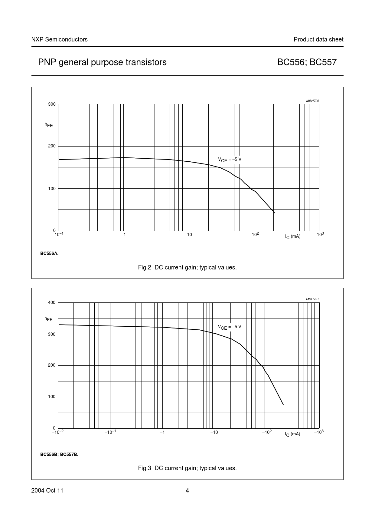 NXP Semiconductors Product data sheet PNP general purpose transistors BC556; BC557 MBH726 300 handbook, full pagewidth hFE 200 VCE = −5 V 100 0 −10−1 −1 −10 I −103 −102 C (mA)