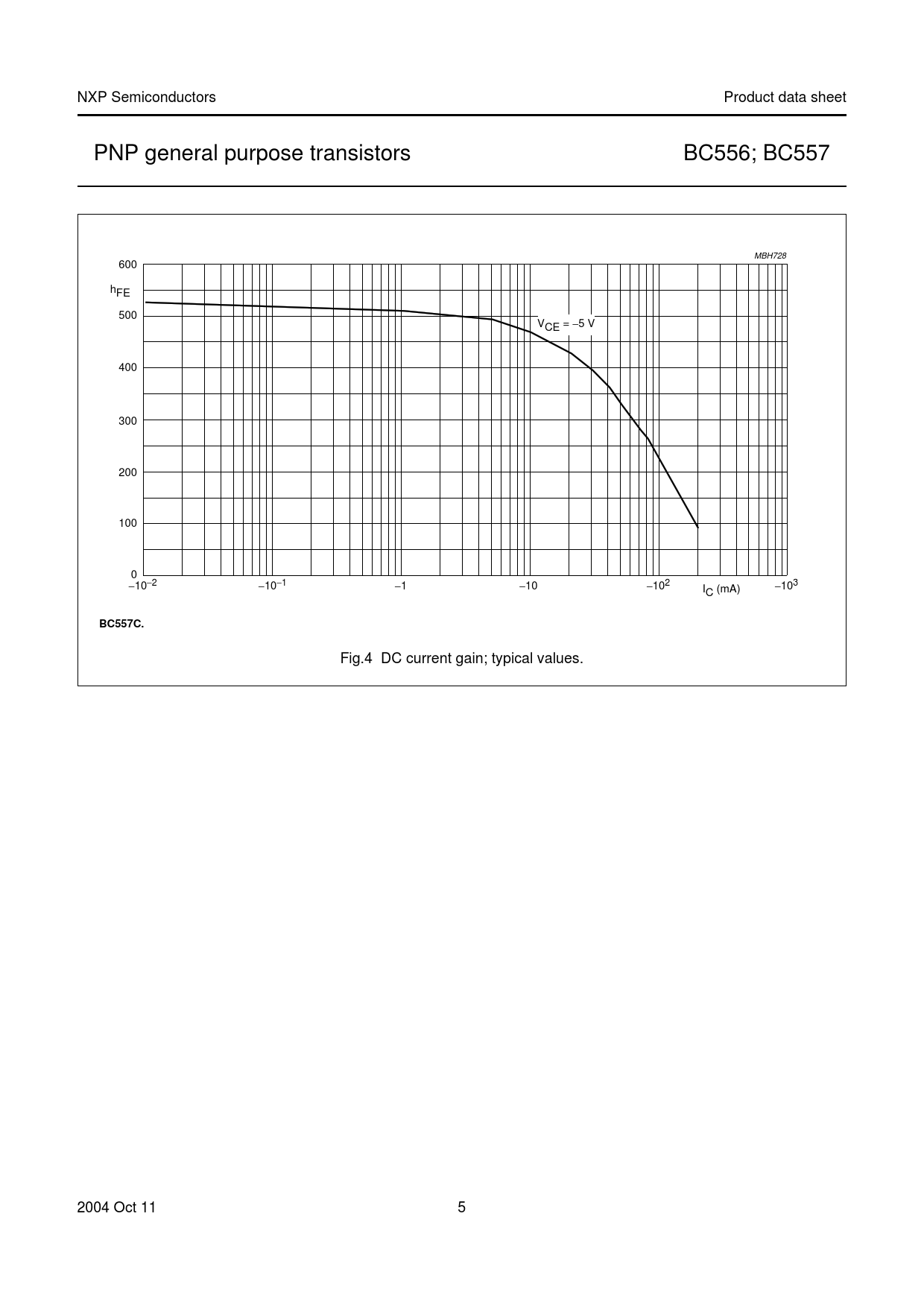 NXP Semiconductors Product data sheet PNP general purpose transistors BC556; BC557 MBH728 600 handbook, full pagewidth hFE 500 VCE = −5 V 400 300 200 100 0 −10−2 −10−1 −1 −10 I −103 −102 C (mA)