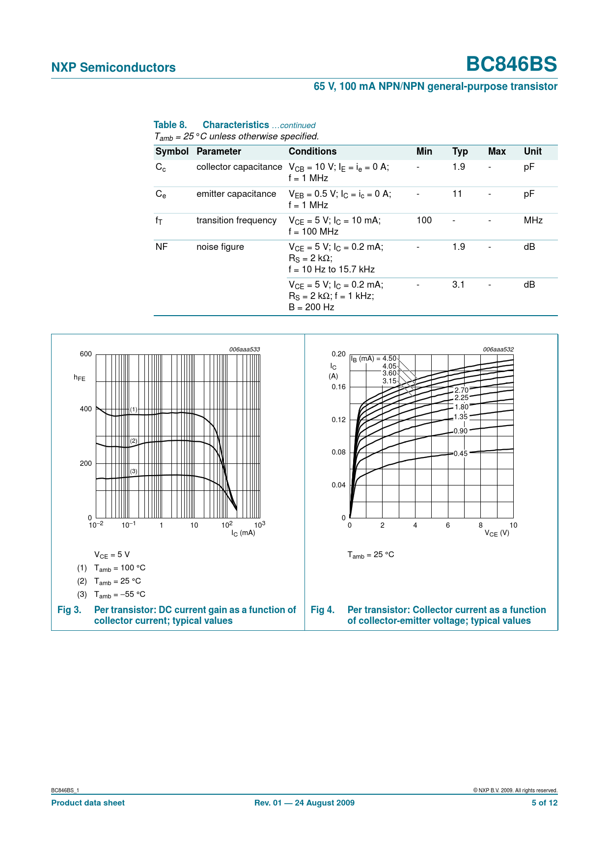 NXP Semiconductors. BC846BS. 65 V, 100 mA NPN/NPN general-purpose transistor. Table 8. Characteristics. Symbol Parameter