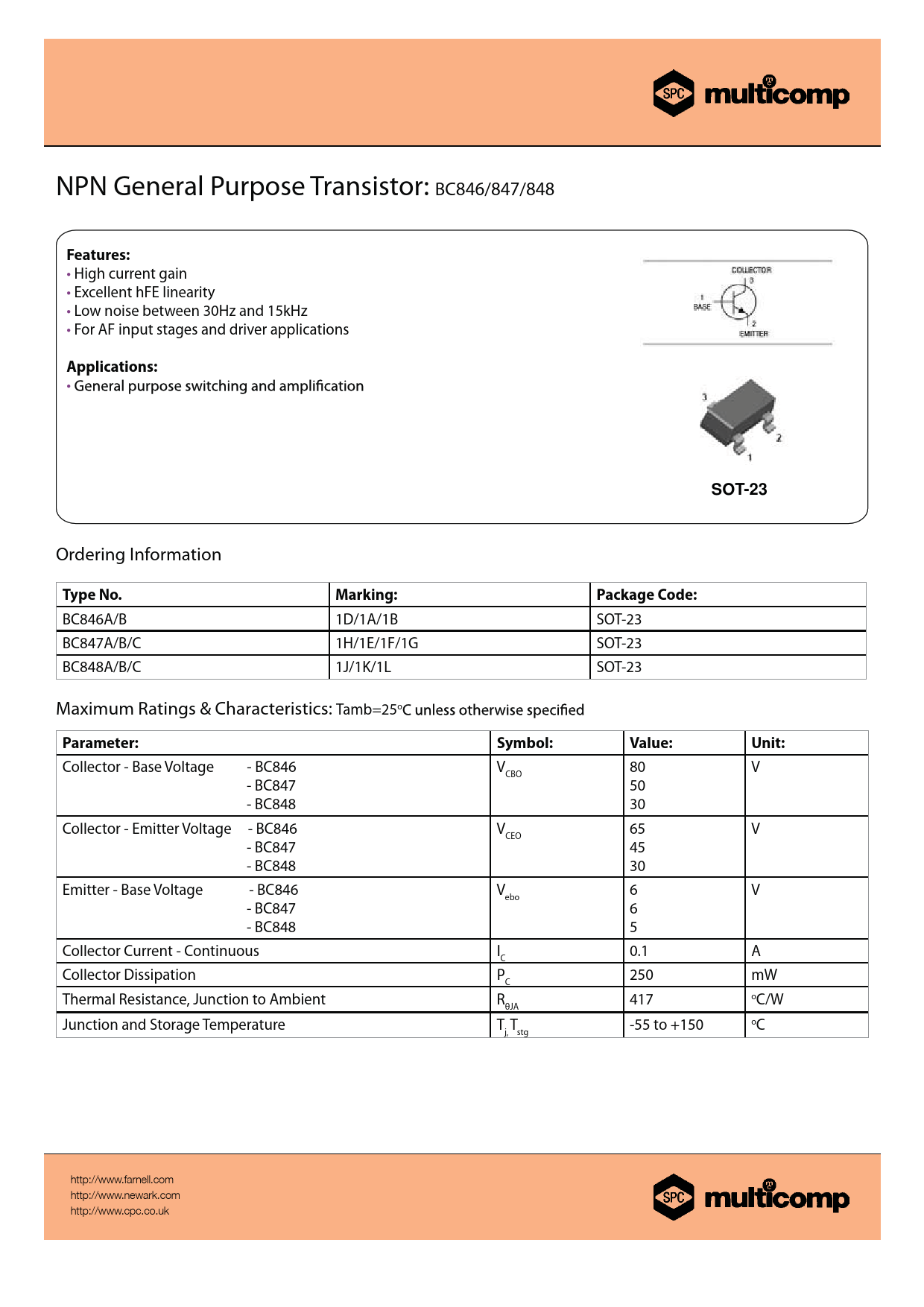 NPN General Purpose Transistor: BC846/847/848 Features: tHigh current gain tExcellent hFE linearity tLow noise between 30Hz and 15kHz tFor AF input stages and driver applications Applications: t SOT-23 Ordering Information Type No.Marking:Package Code: BC846A/B 1D/1A/1B SOT-23 BC847A/B/C 1H/1E/1F/1G SOT-23 BC848A/B/C 1J/1K/1L SOT-23 Maximum Ratings & Characteristics: Tamb=25o Parameter:Symbol:Value:Unit: Collector - Base Voltage - BC846 V 80 V CBO - BC847 50 - BC848 30 Collector - Emitter Voltage - BC846 V 65 V CEO - BC847 45 - BC848 30 Emitter - Base Voltage - BC846 V 6 V ebo - BC847 6 - BC848 5 Collector Current - Continuous I 0.1 A C Collector Dissipation P 250 mW C Thermal Resistance, Junction to Ambient R 417 oC/W θJA Junction and Storage Temperature T T -55 to +150 oC j, stg O[[W!^^^MHYULSSJVT O[[W!^^^UL^HYRJVT O[[W!^^^JWJJV\R