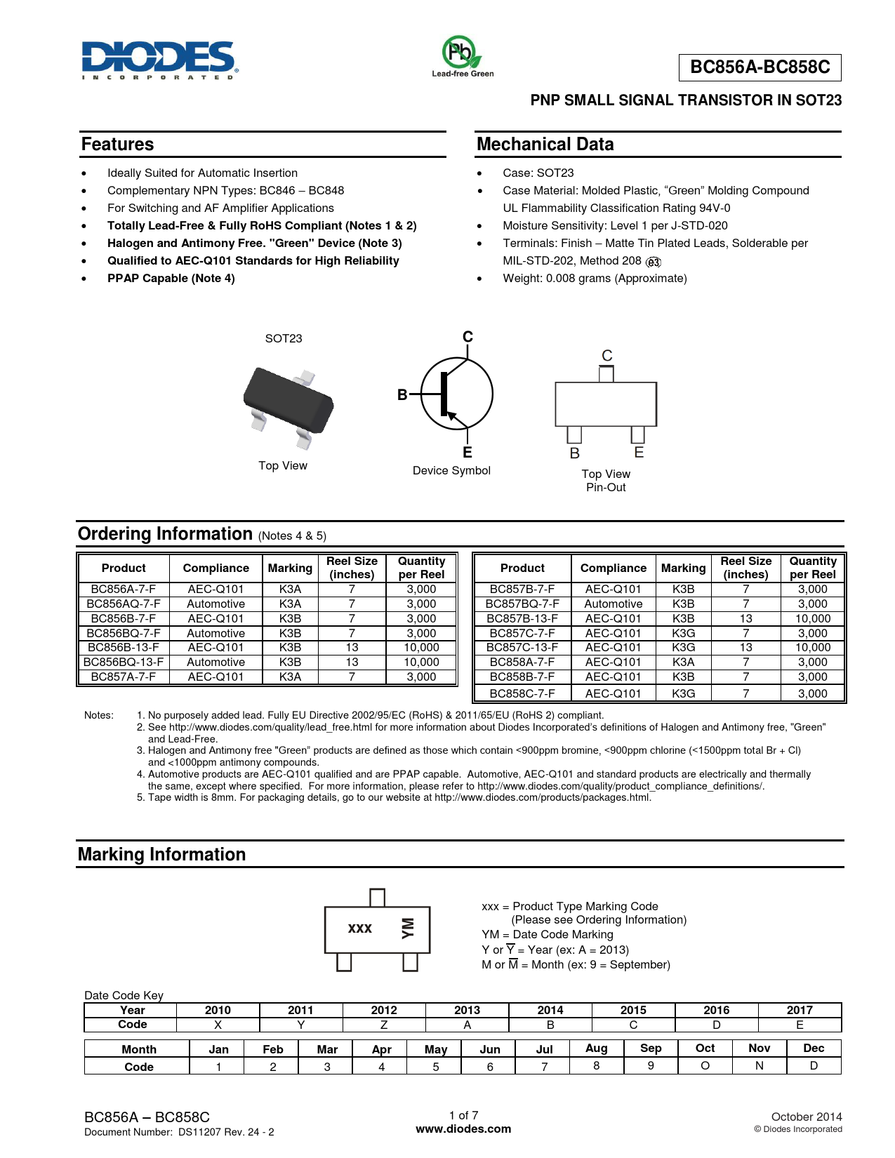 BC856A-7-F AEC-Q101 K3A 7 3,000 BC857B-7-F AEC-Q101 K3B 7 3,000 BC856AQ-7-F Automotive K3A 7 3,000 BC857BQ-7-F Automotive K3B 7 3,000 BC856B-7-F AEC-Q101 K3B 7 3,000 BC857B-13-F AEC-Q101 K3B 13 10,000 BC856BQ-7-F Automotive K3B 7 3,000 BC857C-7-F AEC-Q101 K3G 7 3,000 BC856B-13-F AEC-Q101 K3B 13 10,000 BC857C-13-F AEC-Q101 K3G 13 10,000 BC856BQ-13-F Automotive K3B 13 10,000 BC858A-7-F AEC-Q101 K3A 7 3,000 BC857A-7-F AEC-Q101 K3A 7 3,000 BC858B-7-F AEC-Q101 K3B 7 3,000 BC858C-7-F AEC-Q101 K3G 7 3,000 Notes: 1. No purposely added lead. Fully EU Directive 2002/95/EC (RoHS) & 2011/65/EU (RoHS 2) compliant. 2. See http://www.diodes.com/quality/lead_free.html for more information about Diodes Incorporated’s definitions of Halogen and Antimony free, "Green" and Lead-Free. 3. Halogen and Antimony free "Green” products are defined as those which contain <900ppm bromine, <900ppm chlorine (<1500ppm total Br + Cl) and <1000ppm antimony compounds. 4. Automotive products are AEC-Q101 qualified and are PPAP capable. Automotive, AEC-Q101 and standard products are electrically and thermally the same, except where specified. For more information, please refer to http://www.diodes.com/quality/product_compliance_definitions/. 5. Tape width is 8mm. For packaging details, go to our website at http://www.diodes.com/products/packages.html.