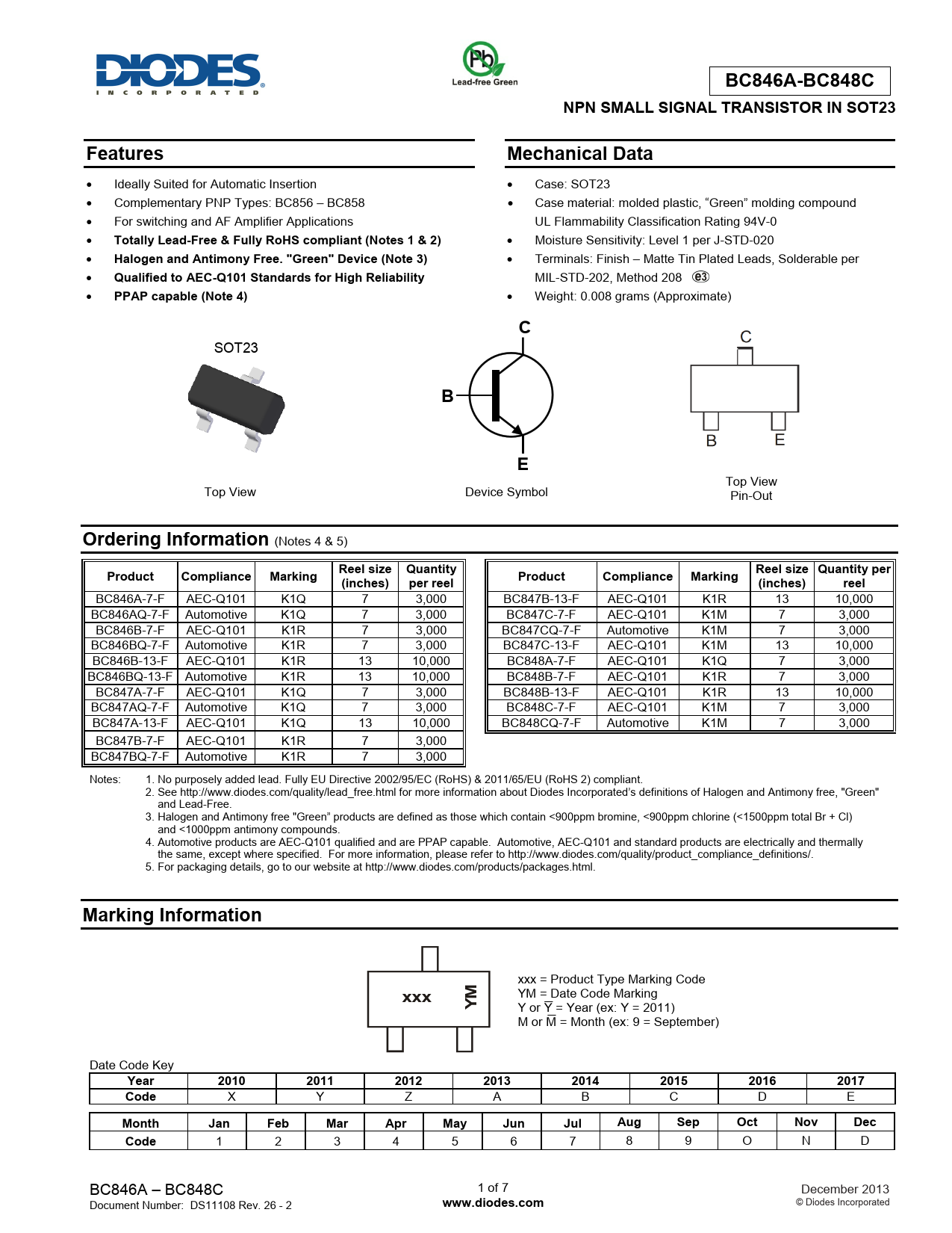 BC846A-7-F AEC-Q101 K1Q 7 3,000 BC847B-13-F AEC-Q101 K1R 13 10,000 BC846AQ-7-F Automotive K1Q 7 3,000 BC847C-7-F AEC-Q101 K1M 7 3,000 BC846B-7-F AEC-Q101 K1R 7 3,000 BC847CQ-7-F Automotive K1M 7 3,000 BC846BQ-7-F Automotive K1R 7 3,000 BC847C-13-F AEC-Q101 K1M 13 10,000 BC846B-13-F AEC-Q101 K1R 13 10,000 BC848A-7-F AEC-Q101 K1Q 7 3,000 BC846BQ-13-F Automotive K1R 13 10,000 BC848B-7-F AEC-Q101 K1R 7 3,000 BC847A-7-F AEC-Q101 K1Q 7 3,000 BC848B-13-F AEC-Q101 K1R 13 10,000 BC847AQ-7-F Automotive K1Q 7 3,000 BC848C-7-F AEC-Q101 K1M 7 3,000 BC847A-13-F AEC-Q101 K1Q 13 10,000 BC848CQ-7-F Automotive K1M 7 3,000 BC847B-7-F AEC-Q101 K1R 7 3,000 BC847BQ-7-F Automotive K1R 7 3,000 Notes: 1. No purposely added lead. Fully EU Directive 2002/95/EC (RoHS) & 2011/65/EU (RoHS 2) compliant. 2. See http://www.diodes.com/quality/lead_free.html for more information about Diodes Incorporated’s definitions of Halogen and Antimony free, "Green" and Lead-Free. 3. Halogen and Antimony free "Green” products are defined as those which contain <900ppm bromine, <900ppm chlorine (<1500ppm total Br + Cl) and <1000ppm antimony compounds. 4. Automotive products are AEC-Q101 qualified and are PPAP capable. Automotive, AEC-Q101 and standard products are electrically and thermally the same, except where specified. For more information, please refer to http://www.diodes.com/quality/product_compliance_definitions/. 5. For packaging details, go to our website at http://www.diodes.com/products/packages.html.