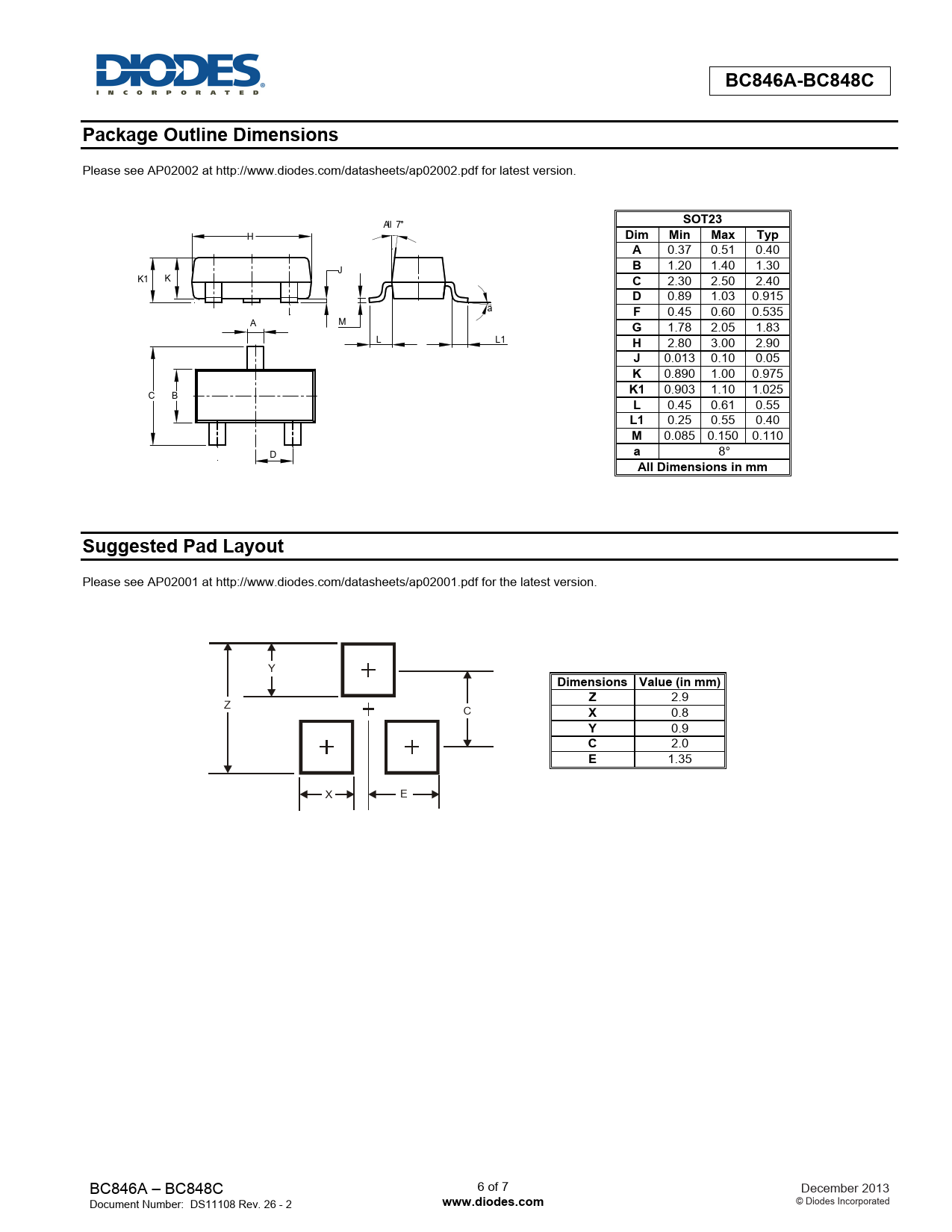 BC846A-BC848C. Package Outline Dimensions. SOT23. Dim Min Max Typ. All Dimensions in mm. Suggested Pad Layout