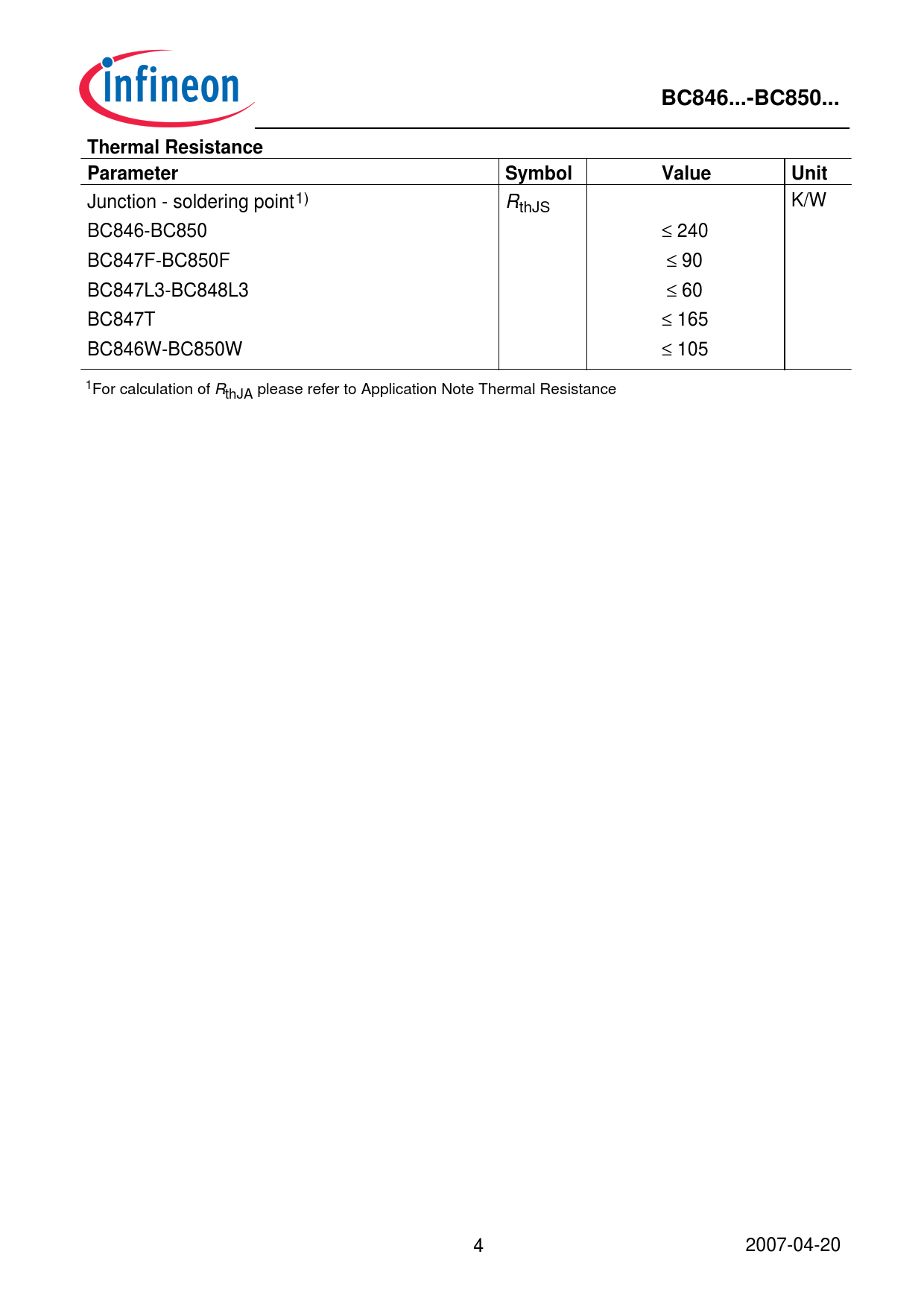 Junction - soldering point1) RthJS K/W BC846-BC850 ≤ 240 BC847F-BC850F ≤ 90 BC847L3-BC848L3 ≤ 60 BC847T ≤ 165 BC846W-BC850W ≤ 105 1For calculation of RthJA please refer to Application Note Thermal Resistance 4 2007-04-20
