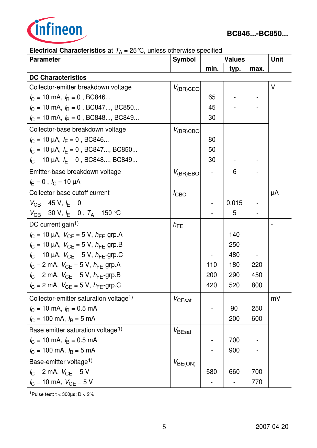 BC846...-BC850... Electrical Characteristics. Parameter. Symbol. Values. Unit. min. typ. max. DC Characteristics
