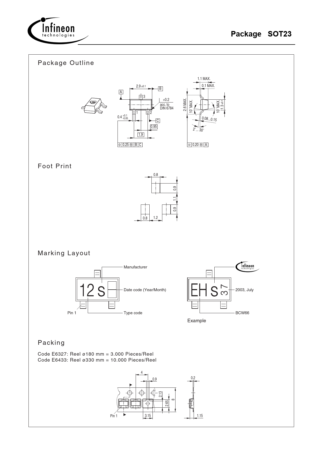 P a c k a g e O u t l i n e 1.1 MAX. 2.9 ±0.1 0.1 MAX. B A 3 +0.2 acc. to ±0.1 MAX. MAX. DIN 6784 2.6 MAX. ˚ ˚ 1.3 1 2 10 10 +0.1 0.4 -0.05 0.08...0.15 C 0.95 2˚... 30˚ 1.9 0.25 M B C 0.20 M A F o o t P r i n t 0.8 0.9 1.1 0.9 0.8 1.2 M a r k i n g L a y o u t Manufacturer Date code (Year/Month) 2003, July Pin 1 Type code BCW66 Example P a c k i n g Code E6327: Reel ø180 mm = 3.000 Pieces/Reel Code E6433: Reel ø330 mm = 10.000 Pieces/Reel 4 0.9 0.2 2.13 8 2.65 Pin 1 3.15 1.15