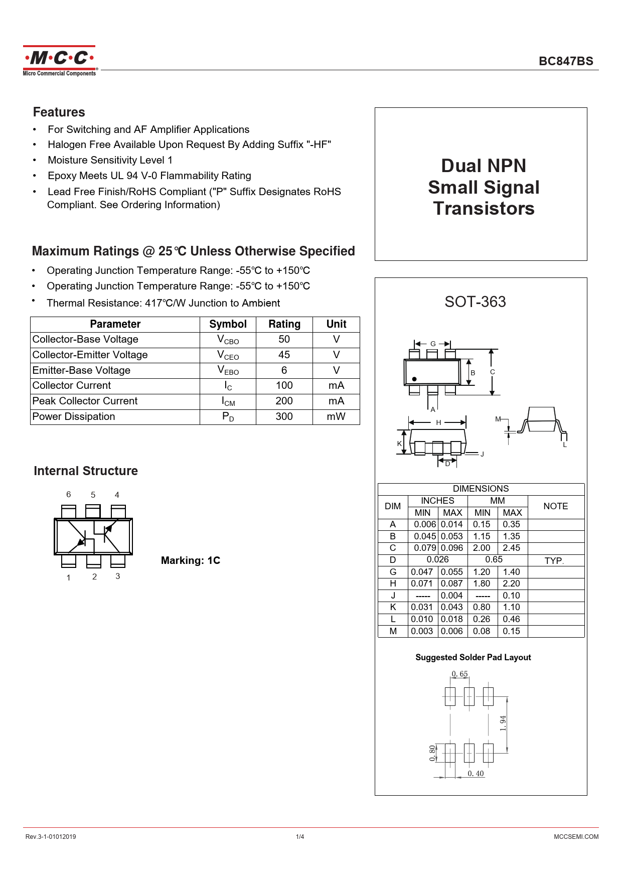 BC847BSFeatures • For Switching and AF Amplifier Applications • Halogen Free Available Upon Request By Adding Suffix "-HF" • Moisture Sensitivity Level 1 Dual NPN • Epoxy Meets UL 94 V-0 Flammability Rating • Lead Free Finish/RoHS Compliant ("P" Suffix Designates RoHS Small Signal Compliant. See Ordering Information) TransistorsMaximum Ratings @ 25°C Unless Otherwise Specified • Operating Junction Temperature Range: -55℃ to +150℃ • Operating Junction Temperature Range: -55℃ to +150℃ • Thermal Resistance: 417℃/W Junction to Ambient SOT-363 ParameterSymbolRatingUnit Collector-Base Voltage VCBO 50 V G Collector-Emitter Voltage VCEO 45 V Emitter-Base Voltage VEBO 6 V B C Collector Current I • C 100 mA Peak Collector Current ICM 200 mA A Power Dissipation PD 300 mW M H K L J Internal Structure D DIMENSIONS 6 5 4 DIM INCHES MM NOTE MIN MAX MIN MAX A 0.006 0.014 0.15 0.35 B 0.045 0.053 1.15 1.35 C 0.079 0.096 2.00 2.45 Marking: 1C D 0.026 0.65 TYP. G 0.047 0.055 1.20 1.40 1 2 3 H 0.071 0.087 1.80 2.20 J ----- 0.004 ----- 0.10 K 0.031 0.043 0.80 1.10 L 0.010 0.018 0.26 0.46 M 0.003 0.006 0.08 0.15 Suggested Solder Pad Layout Rev.3-1-01012019 1/4 MCCSEMI.COM