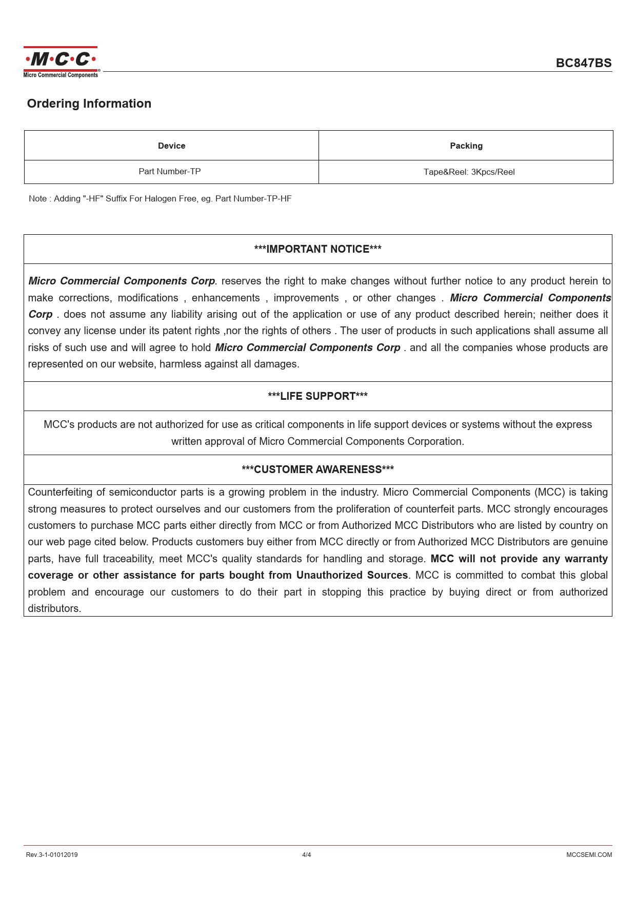 . MCC is committed to combat this global problem and encourage our customers to do their part in stopping this practice by buying direct or from authorized distributors. Rev.3-1-01012019 4/4 MCCSEMI.COM